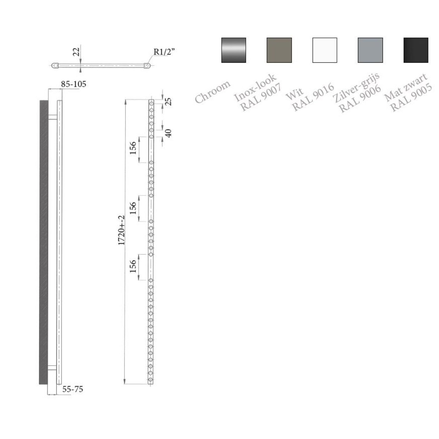 De radiator wordt geleverd inclusief ophanging, automatische ontluchter, 4 montage beugels en thermostaat. (de locatie van de thermostaat is rechtsonder, op aanvraag ook linksonder leverbaar). De afmeting van de radiator is 172 cm hoog, 45 cm breed en hij wordt geleverd in de kleur Inox Look, met een zwart kleurige thermostaat.