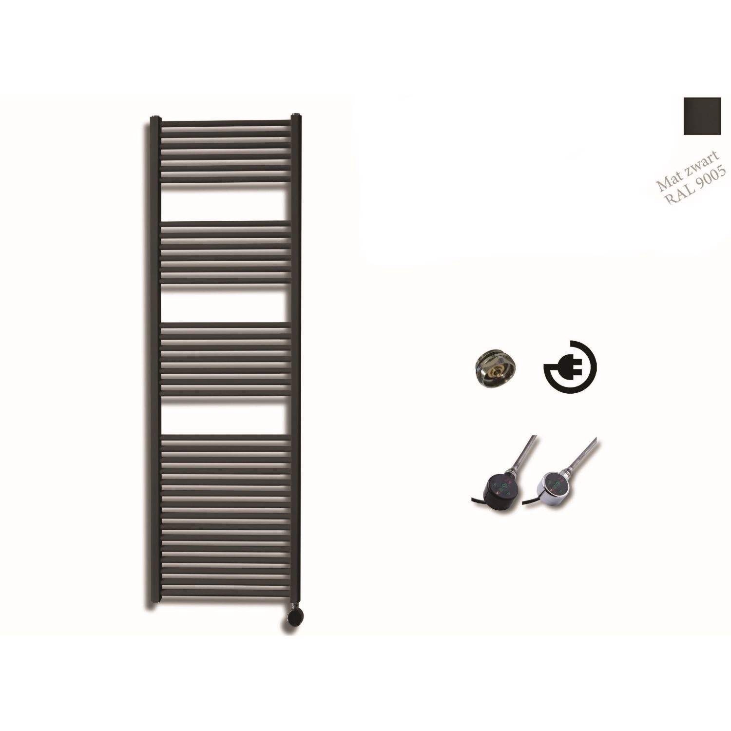 De radiator wordt geleverd inclusief ophanging, automatische ontluchter, 4 montage beugels en thermostaat. (de locatie van de thermostaat is rechtsonder, op aanvraag ook linksonder leverbaar). De afmeting van de radiator is 172 cm hoog, 45 cm breed en hij wordt geleverd in een mat zwarte kleur, met een chroom kleurige thermostaat.