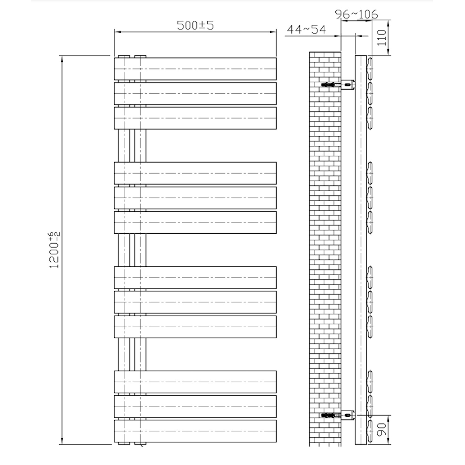 De radiator heeft een hoogte van 120 cm en een breedte van 50 cm. De radiator heeft een wattage van 593 en is ook verkrijgbaar in een witte kleur.