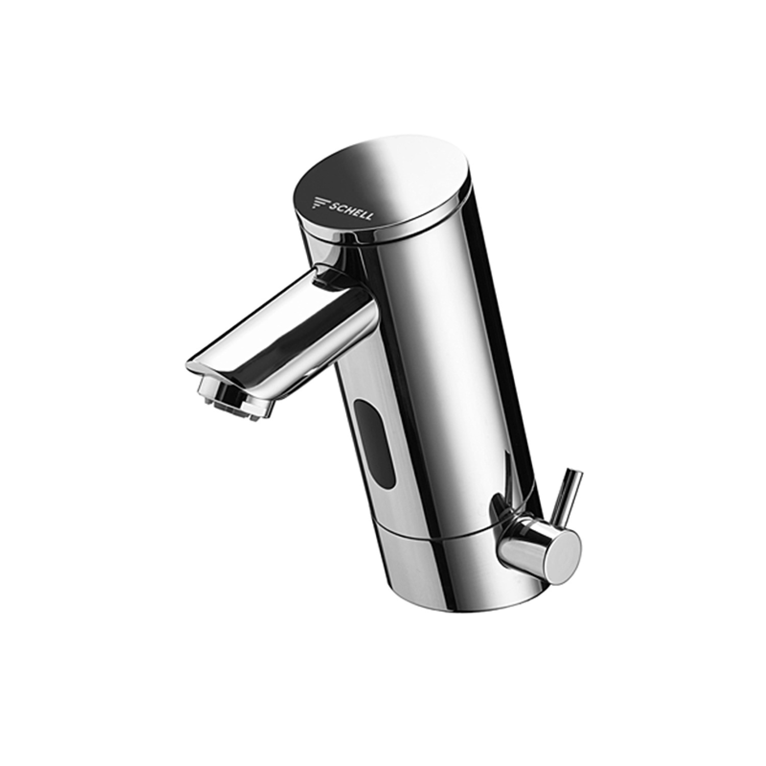 De Puris ND-K wastafelmengkraan is van het merk Schell en kent een elektronische uitvoering. Met behulp van de infrarood-sensor die zich in de kraan bevindt schakelt u deze eenvoudig aan. De mengkraan is gemaakt van messing en is afgewerkt in een glanzend chromen kleur. De wastafelkraan is een standaard model en heeft een hoogte van 16 cm. De diameter van het kraangat bedraagt 33 mm: houd hier dus rekening mee bij het monteren van de kraan op een wastafel. De kraan werkt op basis van een inbouwtransformator die standaard wordt meegeleverd.