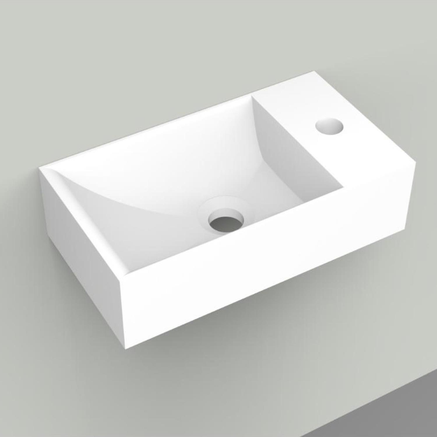 Deze moderne fontein Marble Free is geschikt voor vrijwel iedere sanitaire ruimte. De wastafel is enkel op een manier te plaatsen namelijk recht tegen de muur met het kraangat en de kraan naar rechts. De bevestigingspunten bevinden zich uit het zicht van de gebruiker.