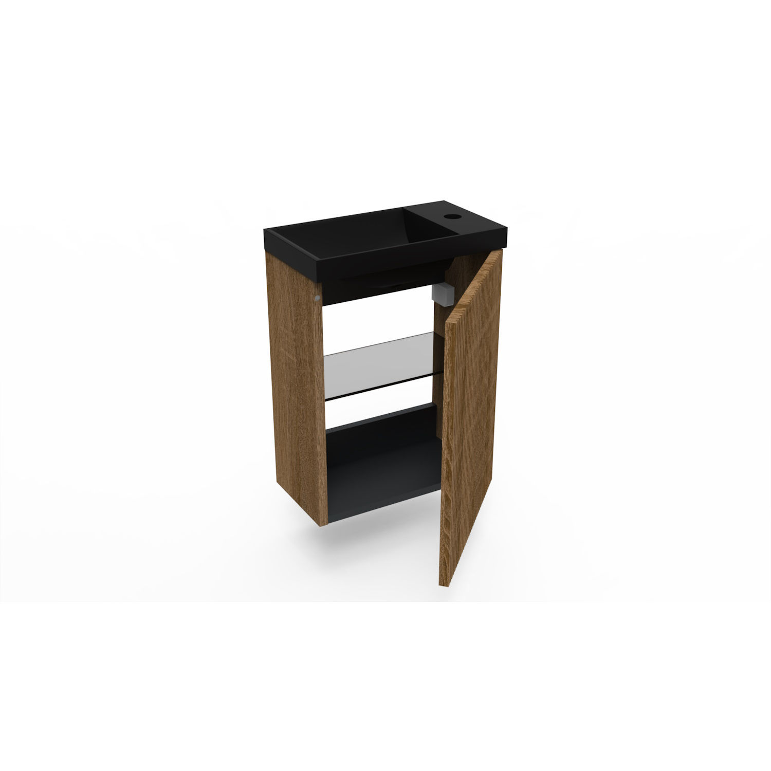 Deze fonteinkast is van het merk Arcqua uit de serie Ridge en is Cafe Oak van kleur. De fonteinkast is erg compact, hierdoor past de fonteinkast gemakkelijk in kleinere ruimtes zoals het de toiletruimte. Ook biedt dit kastje veel extra opbergruimte. In het midden zit een extra glazen plankje gemonteerd, zodat u de volledige hoogte van het kastje kunt benutten. De enkele deur is voorzien van een push to open systeem. Bovendien hangt het meubel aan de wand, waardoor je ruimte op de vloer overhoudt! En word inclusief bevestigingsmateriaal geleverd. De onderkast is gemaakt van MDF.