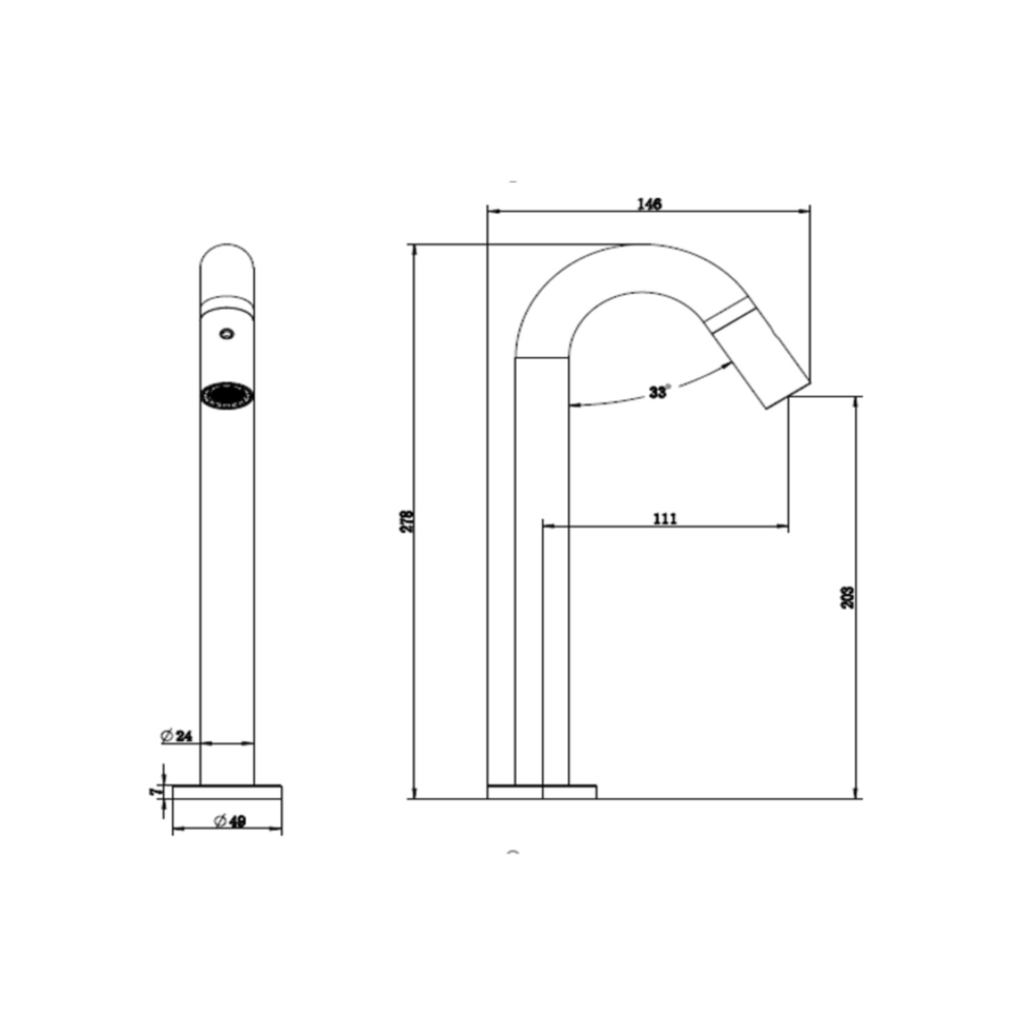 De kraan is gemaakt van messing en uitgevoerd in de kleur geborsteld chroom. Omdat de kraan verhoogd is, past hier een waskom onder geschikt als fontein in het toilet. De uitloop van de kraan is namelijk 20.3 cm hoog. De gehele kraan is 27.8 cm hoog. Daarnaast is de uitloop 11.1 cm lang. De uitloop heeft een hoek van 33 graden.