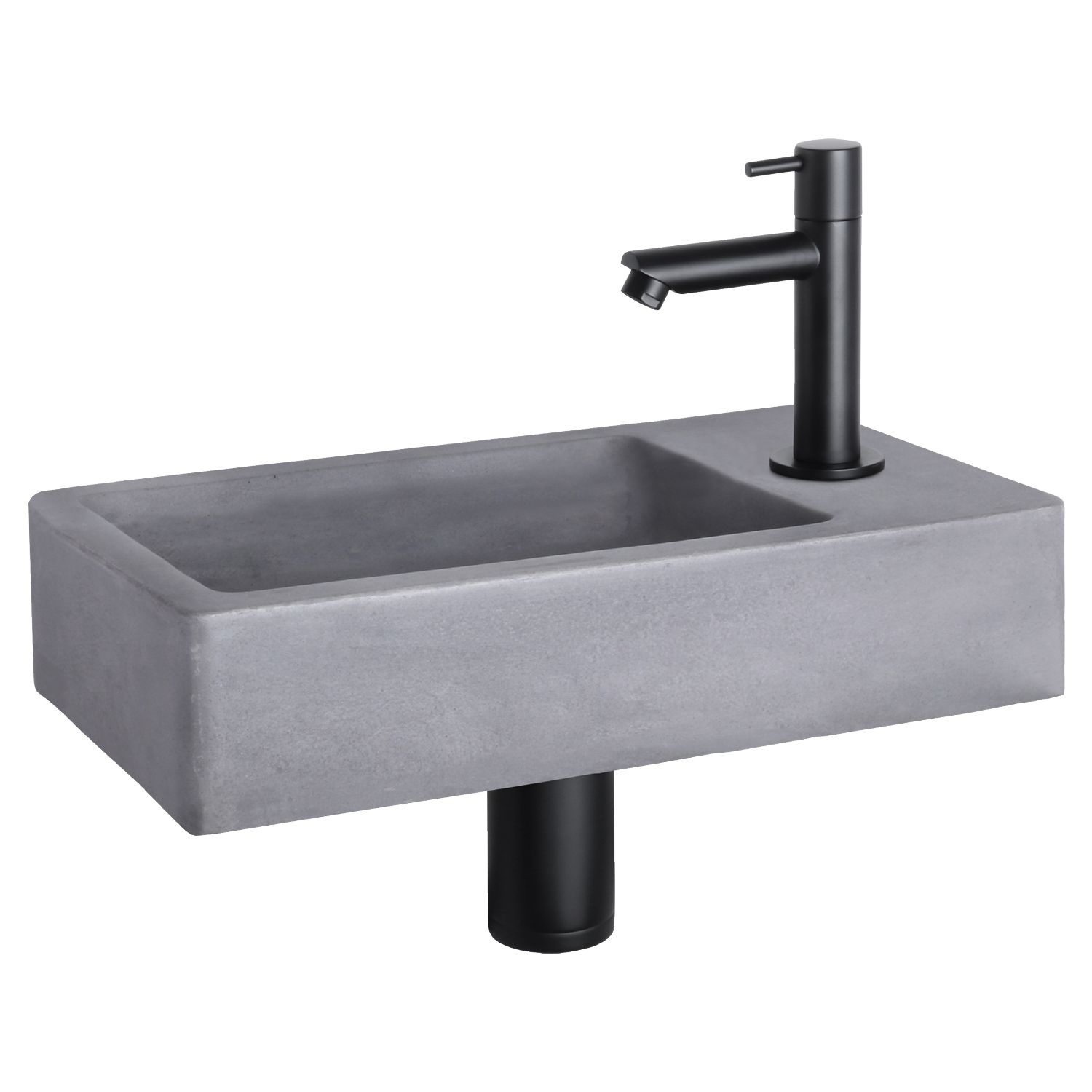 Deze combinatie bestaat uit het stijlvolle donker betonnen fontein Force met mat zwarte rechte koudwaterkraan, afvoerplug en sifon. Het kraangat zit aan de rechterkant van dit stijlvolle wasbakje. Het betonnen materiaal is zeer stevig en heeft een waterdichte coating. Beton zorgt voor een industriële uitstraling.