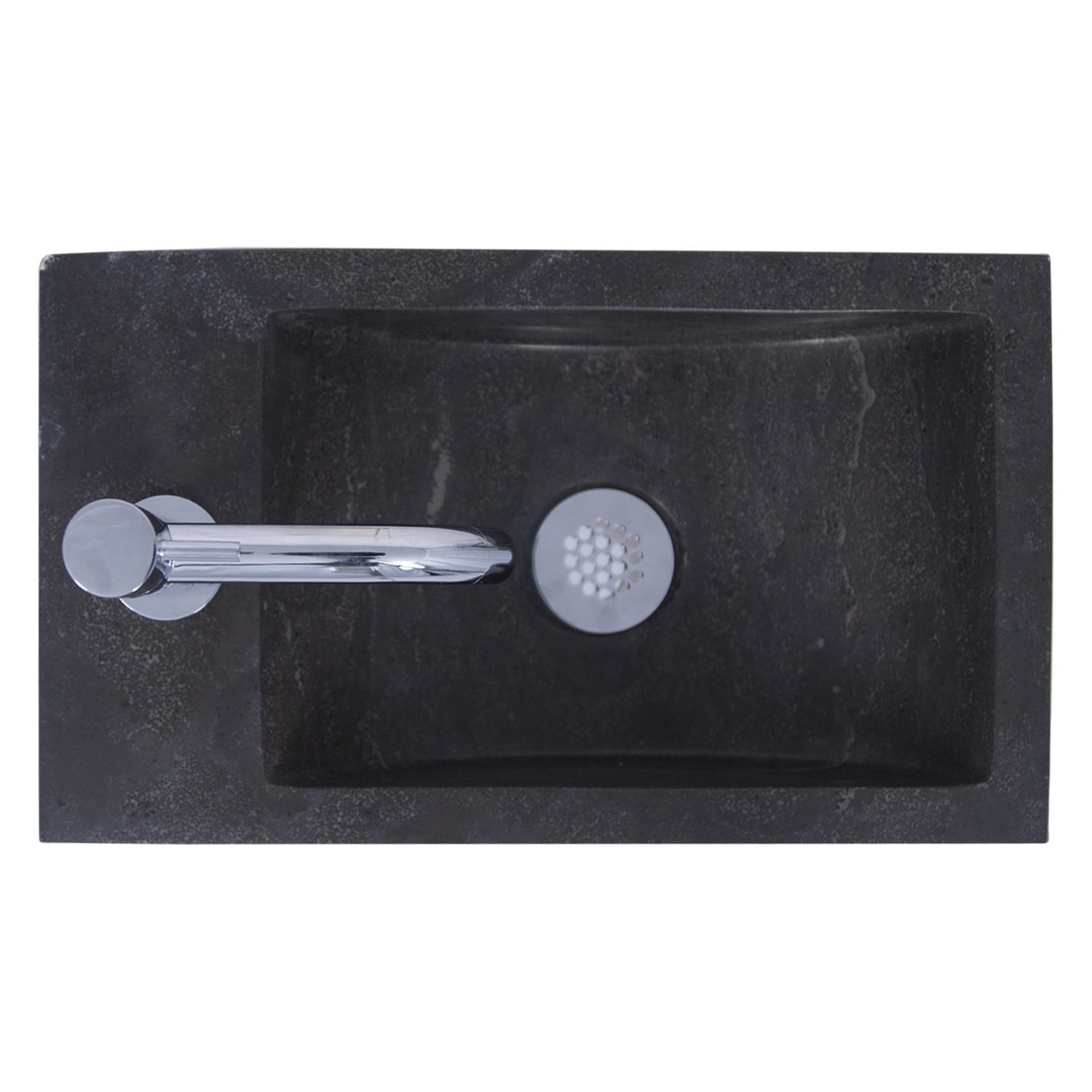 Kalkstenen fonteinset met een chrome kraan en sifon. Het set is eenvoudig te monteren, bijgevoegd ziet u de technische tekening. Hierop zijn alle maten aangegeven zodat u gemakkelijk kunt meten of dit gave fonteinset ook in uw toilet past. De set wordt compleet geleverd inclusief een fonteinkraan en sifonset. De fontein is 40x23x11 cm en is hierdoor groot genoeg om gemakkelijk uw handen te wassen. De kraan en sifon zijn van hoogwaardige kwaliteit en mat chroom uitgevoerd.