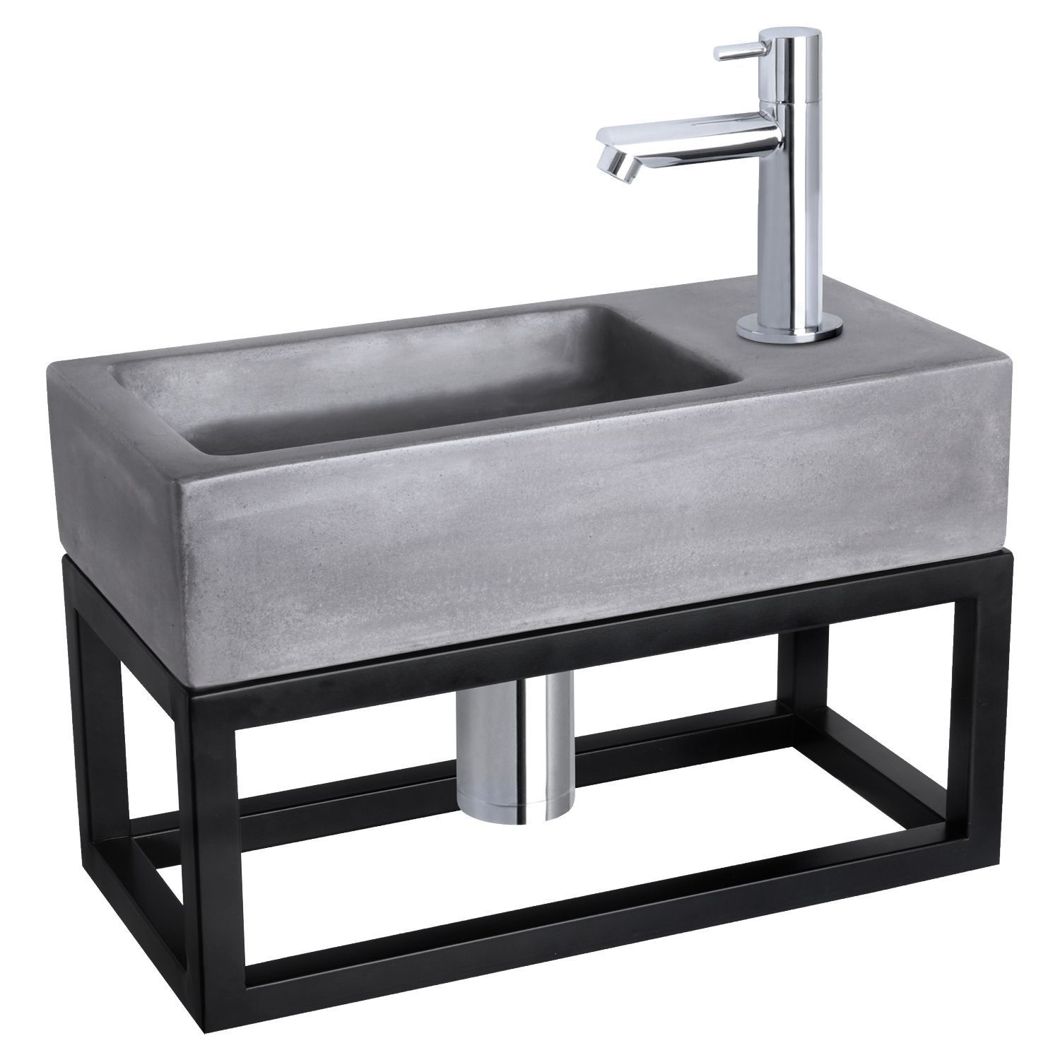 Deze combinatie bestaat uit het stijlvolle donker betonnen fontein Ravo met chromen rechte koudwaterkraan, afvoerplug en sifon. Het handige bijpassende Chroome handdoekrek, waar u bijvoorbeeld uw handdoeken of andere toiletbenodigheden kunt plaatsen of hangen, maakt de set helemaal af. Het kraangat zit aan de rechterkant van dit stijlvolle wasbakje. Het betonnen materiaal is zeer stevig en heeft een waterdichte coating. Beton zorgt voor een industriële uitstraling en is goed te combineren.