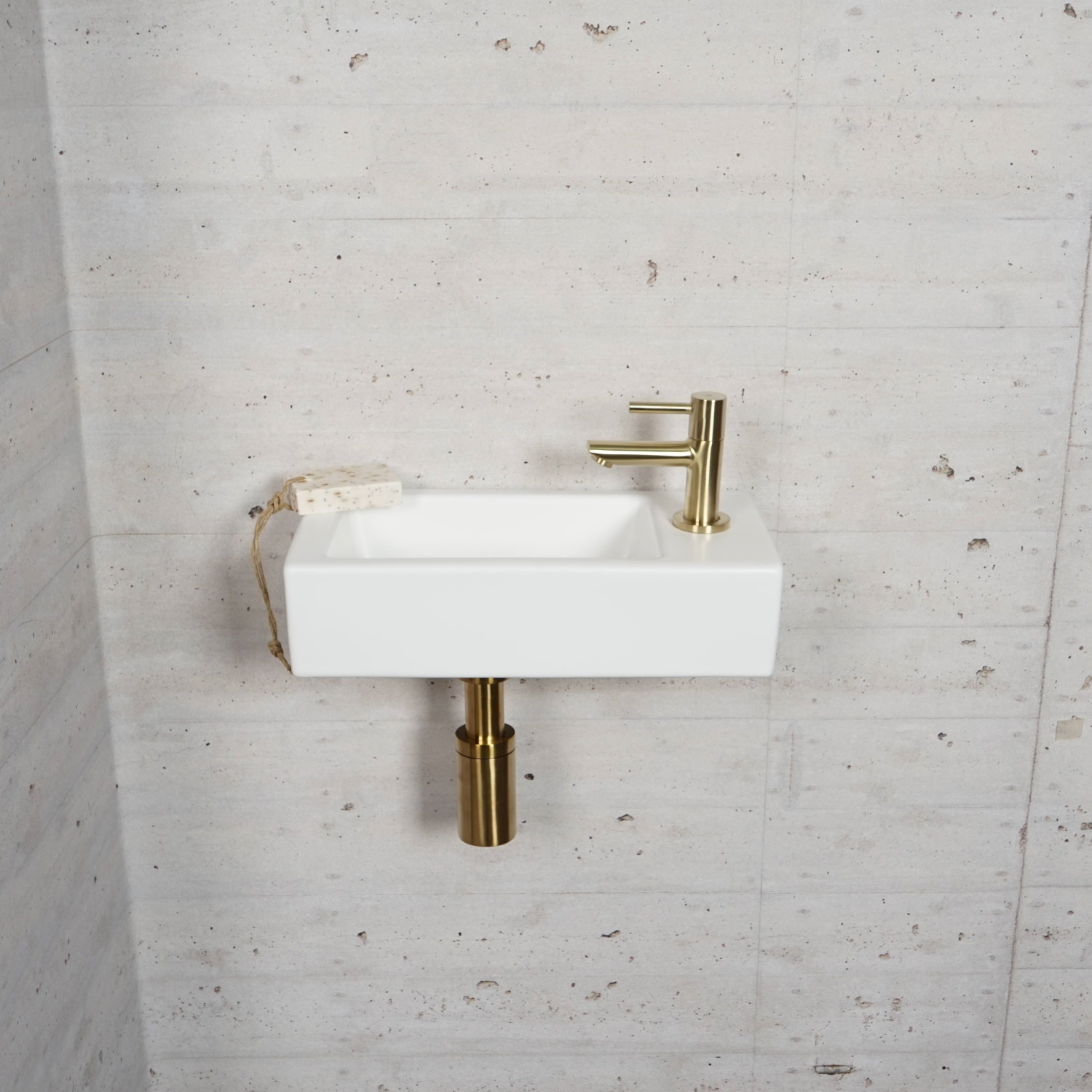 Een complete moderne fonteinset wat u een mooi prijsvoordeel oplevert. De Mat Witte Fontein set Wiesbaden Color is gecombineerd met een Messing (Gouden geborstelde Look) kraan. De set word compleet gemaakt met een Messing goud clickwaste en sifon.