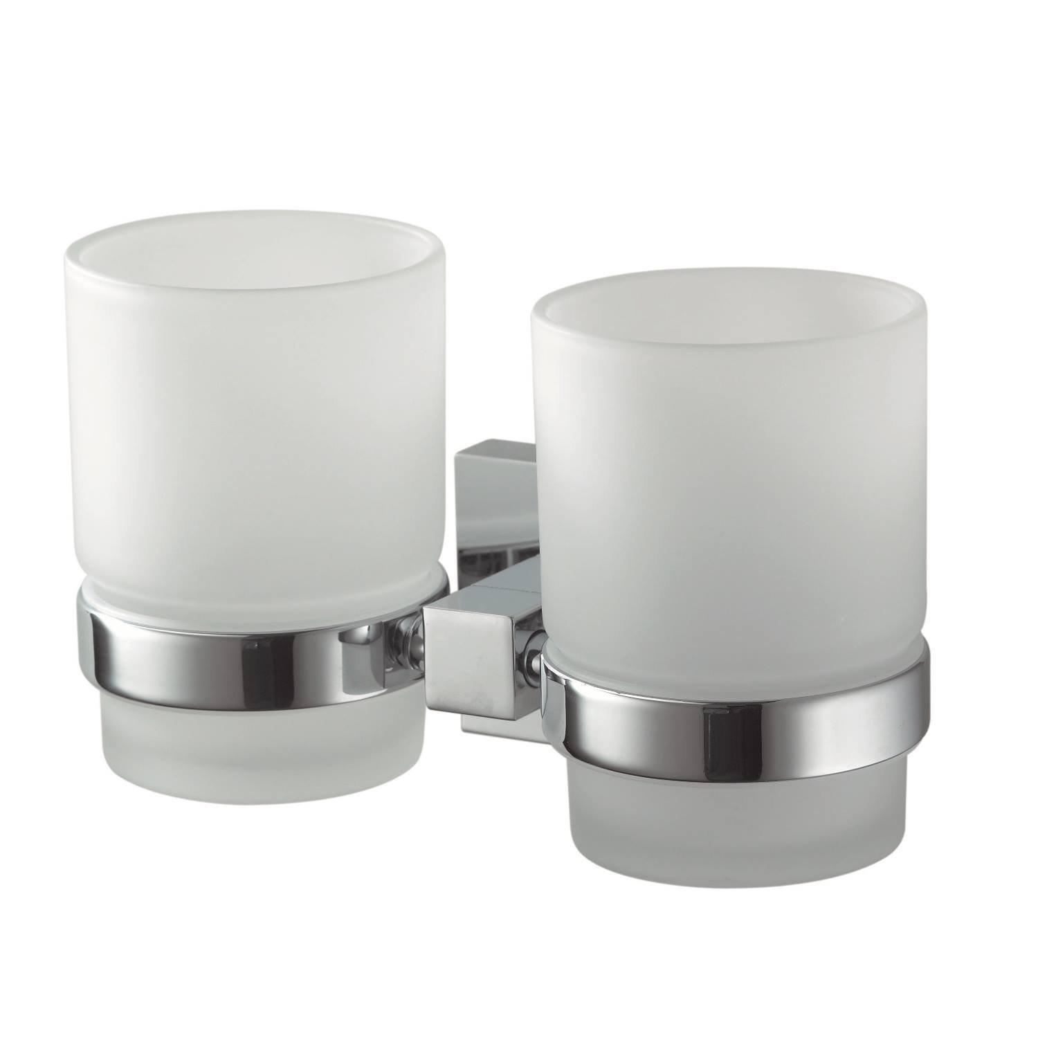 Dubbele glashouder met een opvallend mooi design: een combinatie van ronde en vierkante vormen. En een tweede beker is altijd handig. Zo kunt u er één gebruiken voor uw tandenborstel en één om uit te drinken. Of allebei een eigen glas nemen. De bekers zijn makkelijk uitneembaar en gemaakt van mat glas. De bekers zijn getest en voldoen aan de Europese normen voor artikelen die met voedsel in aanraking komen. Dit betekent dat de bekers geen gevaarlijke stoffen afgeven en dat u er gegarandeerd veilig uit kunt drinken.