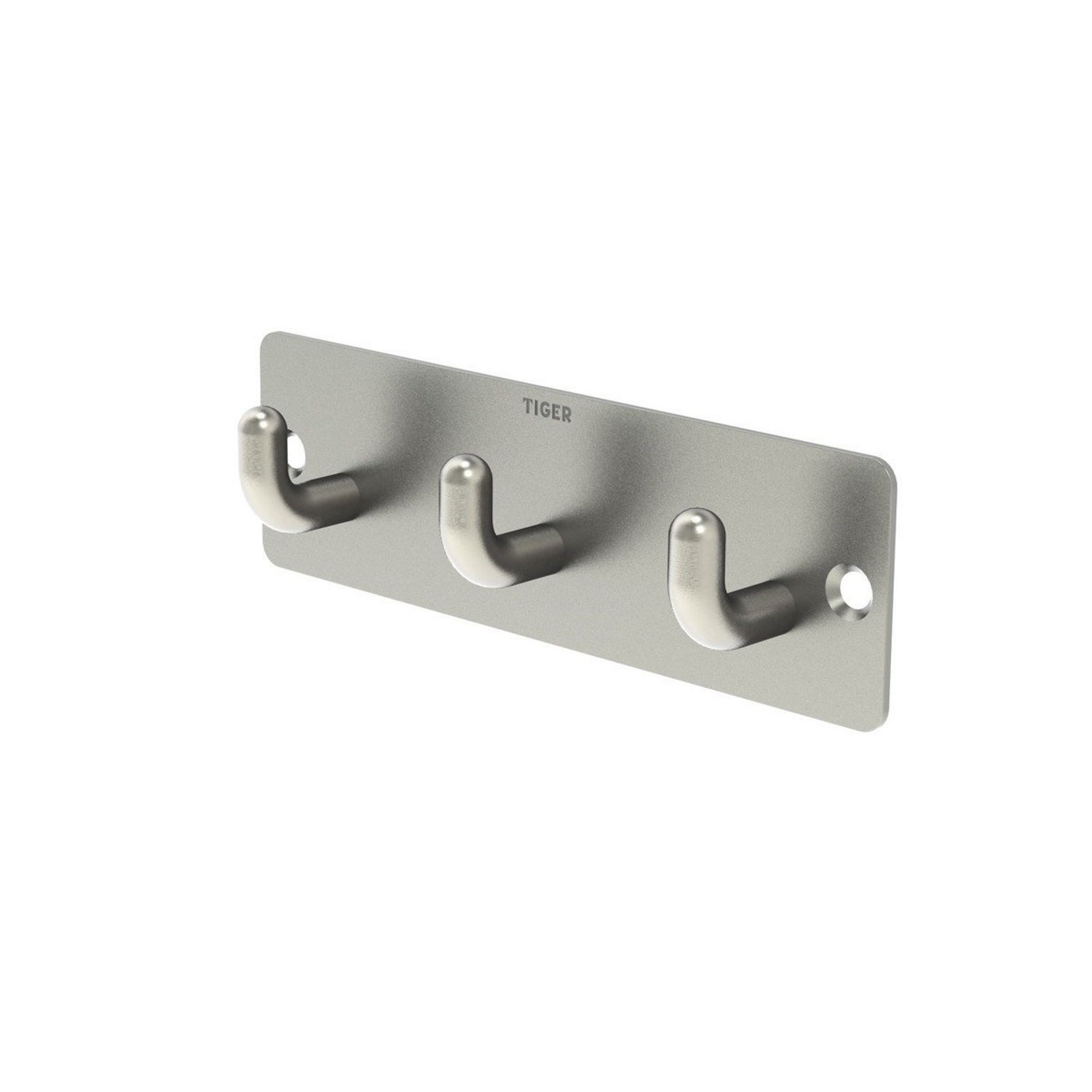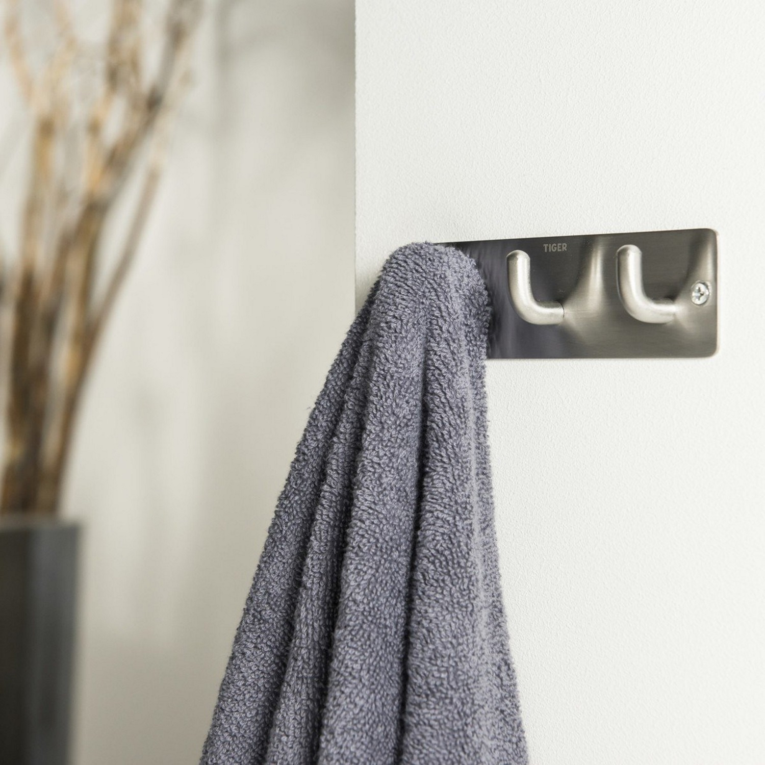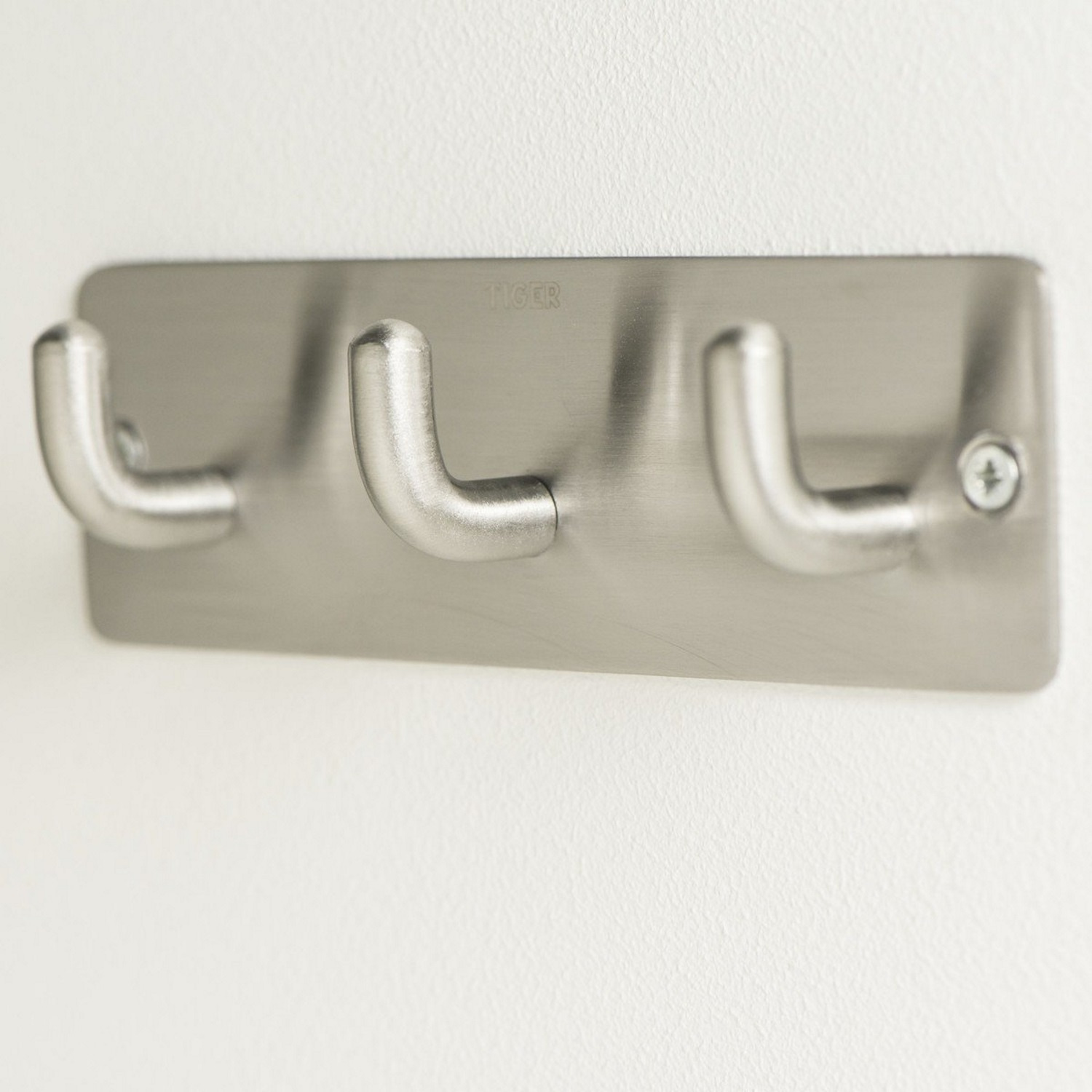 Deze stijlvolle haak van het merk Tiger is gemaakt van geborsteld roestvrij staal, het materiaal is licht mat zilver van kleur. De 3-delige haak is eenvoudig te bevestigen met de bijgeleverde schroeven. De haak kan worden gebruikt voor het ophangen van bijvoorbeeld uw handdoek en/of badjas en heeft een moderne uitstraling. De producten van het merk Tiger zijn allen voorzien van 5 jaar fabrieksgarantie.