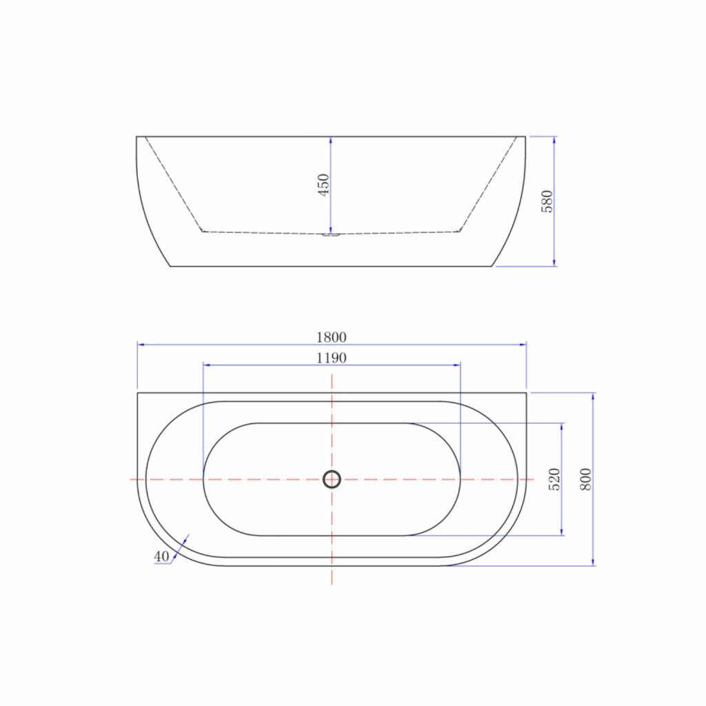 Het bad is 180cm lang en 80cm breed, genoeg om gezellig met zijn tweeën in te zitten. De afvoer zal niet in de weg zitten want die zit netjes in het midden. De rand van het bad is 3.5cm breed. Er zit overigens een bad afvoer bij het bad voorzien van een chromen click waste, sifon met flexibele afvoerpijp van 40mm. (Sifon steekt er niet onderuit.) Is daarnaast voorzien van een overloop.