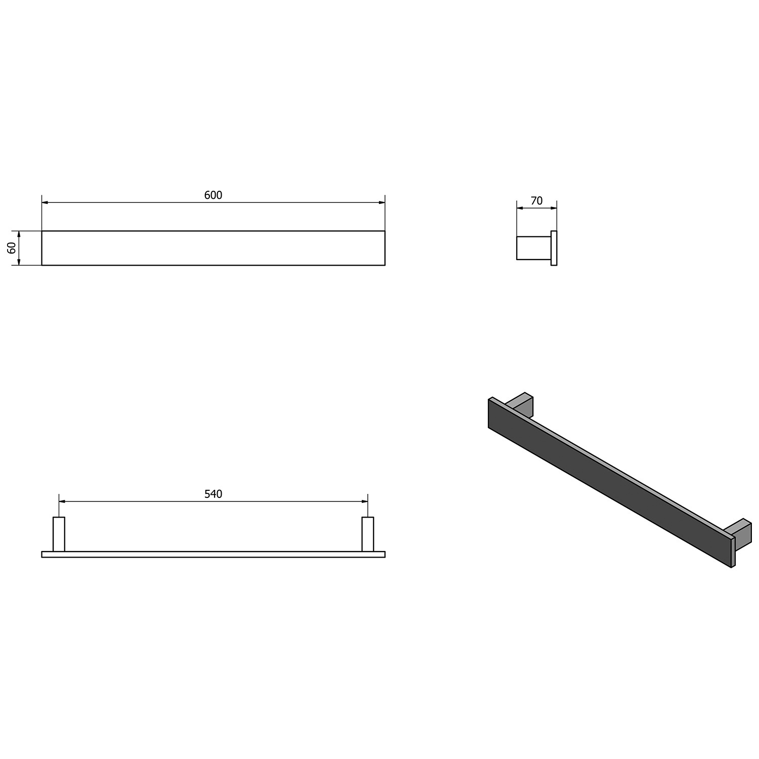 De handdoekhouder is 60 cm breed en 6 cm hoog. De houder komt 7 cm van de muur af en wordt aan de muur bevestigt met schroeven.