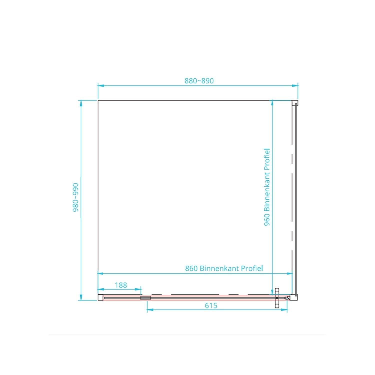 Douchedeur is verstelbaar van 88 cm tot 89 cm en de zijwand is verstelbaar van 98 cm tot 99 cm.