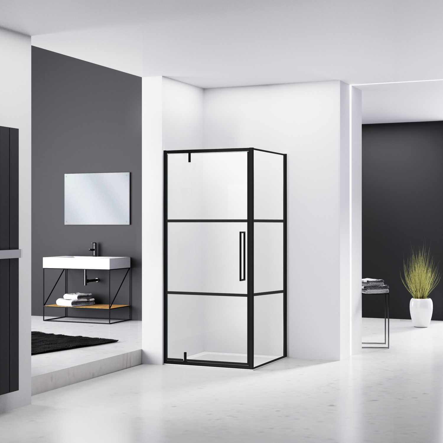 Het glas wordt opgedeeld in 3 delen door de dubbele zwarte lijnen. Deze lijnen zijn er door middel van zeefdruk in bewerkt, en zijn dus niet hetzelfde materiaal als het frame. De afmeting van de hoek douchecabine is 90x100x200 en heeft een deuropening van 61,5 cm. De deur is gemakkelijk te openen en te sluiten door middel van de dubbelzijde metalen handgrepen. Daarnaast is de deur zowel links als rechts toe te passen.
