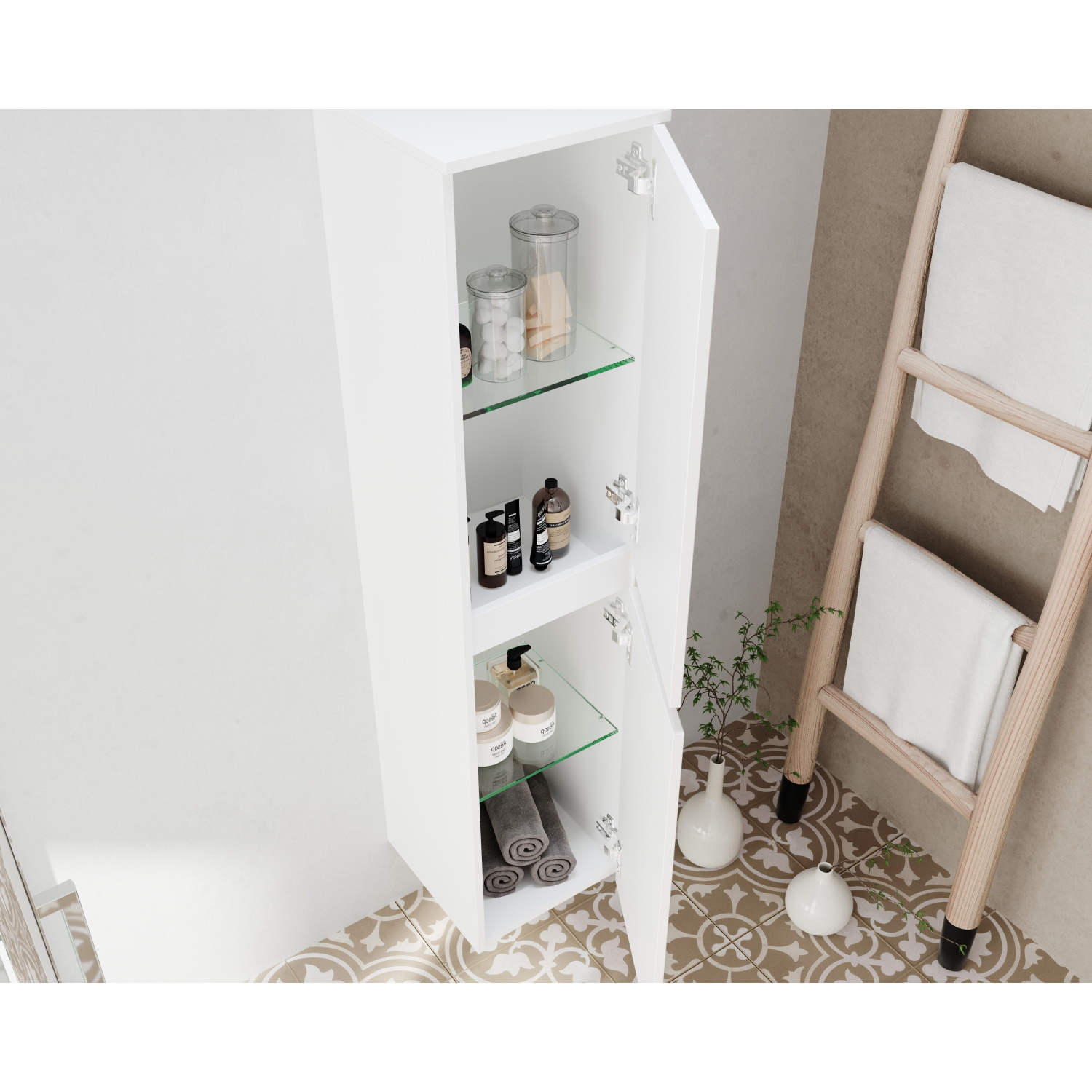 Uit de serie Ada van Van Marcke komt deze fraaie hoge kolomkast. De kolomkast heeft een glanzend witte kleur en is voorzien van twee softclose deuren en twee binnenplanken. De binnenplanken zijn van glas. De hoge kolomkast is greeploos en meet 31.4 cm lang. De breedte is 31,5 cm en hij is 136 cm hoog. Het materiaal bestaat uit spaanplaat kern met melamine voor- en zijkanten.