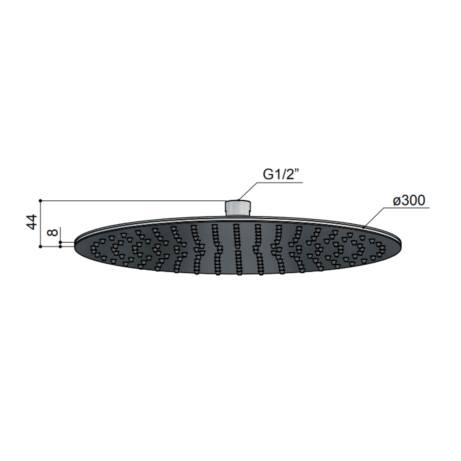 De douche heeft een diameter van 30 cm en een totale hoogte van 4.4 cm. Wat deze hoofddouche extra speciaal maakt is dat deze hoofddouche dus maar 8 mm dun is. In tegenstelling tot normale hoofddouches die regelmatig een dikte hebben van 2 cm.