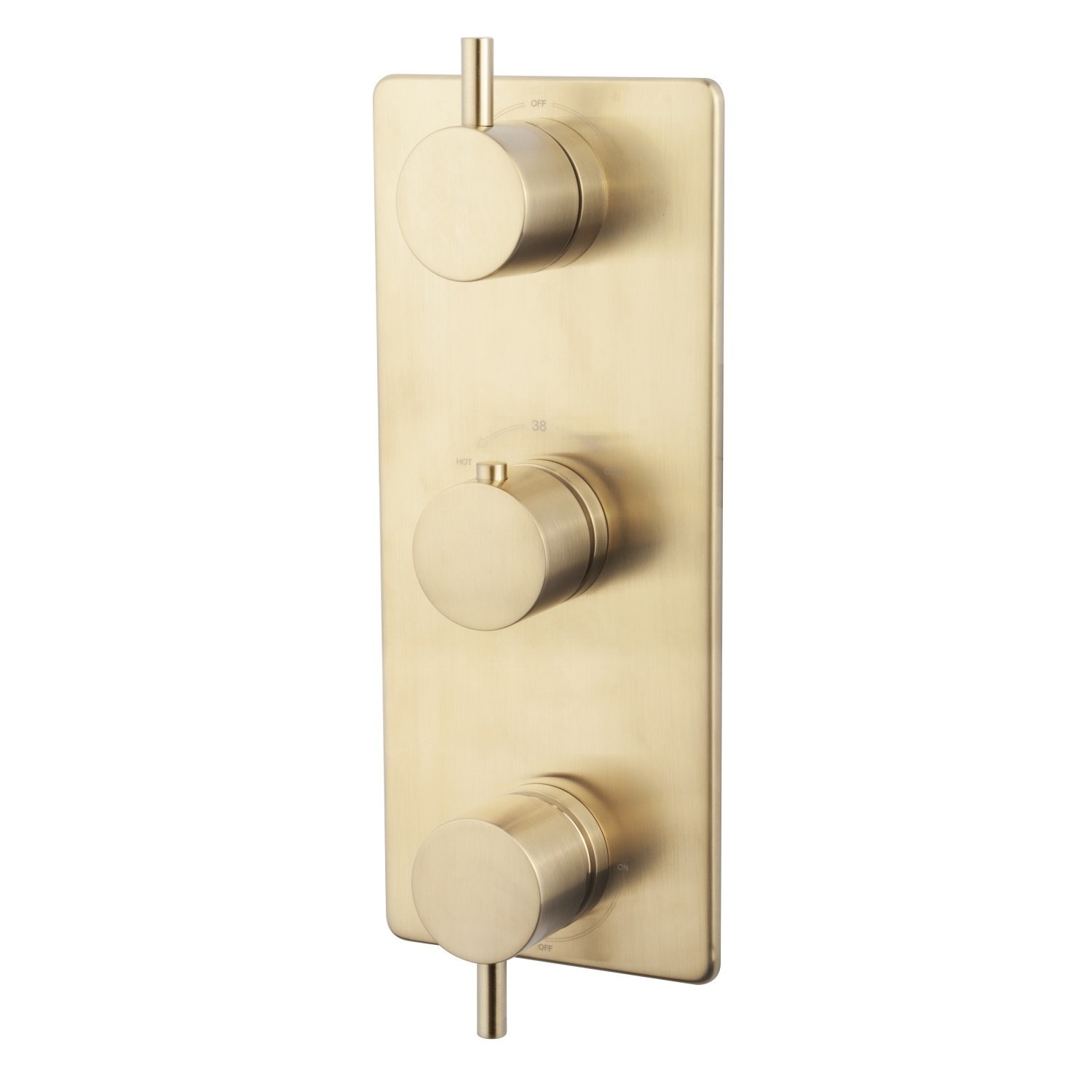 Het afbouwdeel is gemaakt van het materiaal messing. Deze afbouwset heeft een volledige finish van geborsteld koper. Dit afbouwdeel betreft een 3-wegs thermostaat. Dit houdt in dat er 3 functies op aangesloten kunnen worden.