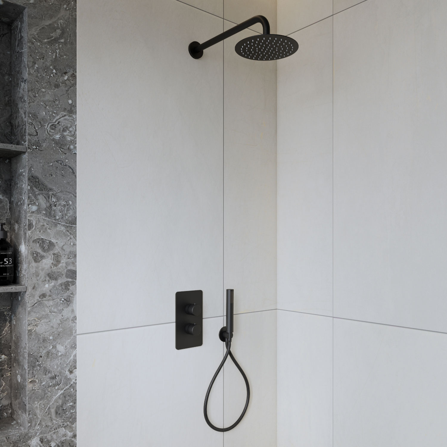 Met de inbouw regendoucheset Colorato van het merk Boss & Wessing haalt u een complete doucheset in huis! De inbouw regendoucheset bestaat uit een thermostatische kraan, een wanduitloop met een ronde hoofddouche en een handdoucheset. Alle elementen uit de Colorato inbouw regendoucheset zijn gemaakt van messing en kennen een afwerking in een mat zwarte kleur. Bovendien is deze set leverbaar in de kleur chroom.
