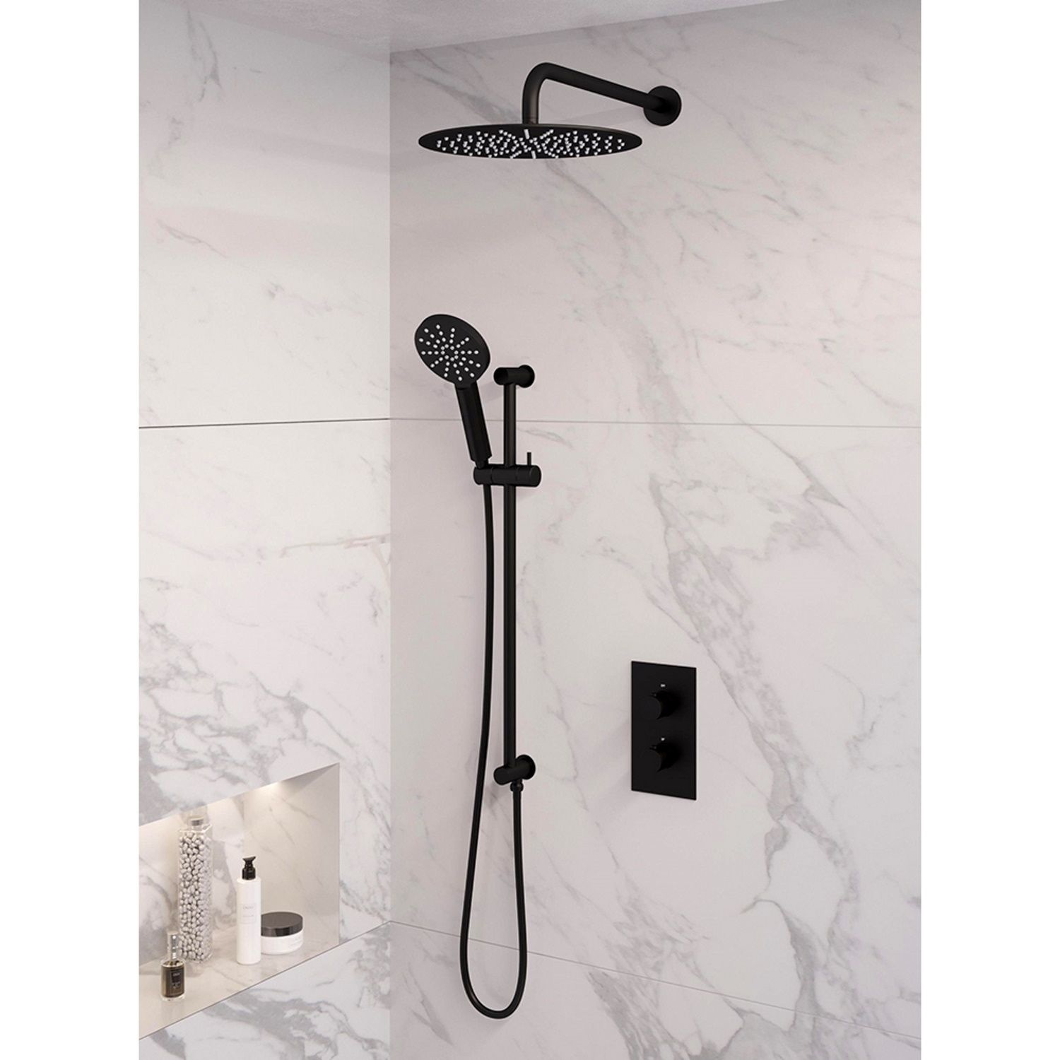 De set bestaat uit een inbouwthermostaat, een afbouw deel van de thermostaat kraan, een wandarm, een hoofddouche met een diameter van 30 cm, een handdouche inclusief glijstang en doucheslang. De thermostaatkraan, met 3/4'' aansluiting, is eenvoudig te bedienen door de twee knoppen. Met de onderste knop kunt u eenvoudig de temperatuur van het water instellen. De thermostaat beschikt over een kinderbeveiliging bij 38 graden, waardoor u nooit per ongeluk onder een kokend hete douche zat staan. met de bovenste knop bepaalt u de gewenste douchstand en kunt u switchen tussen de hoofd- en handdouche.