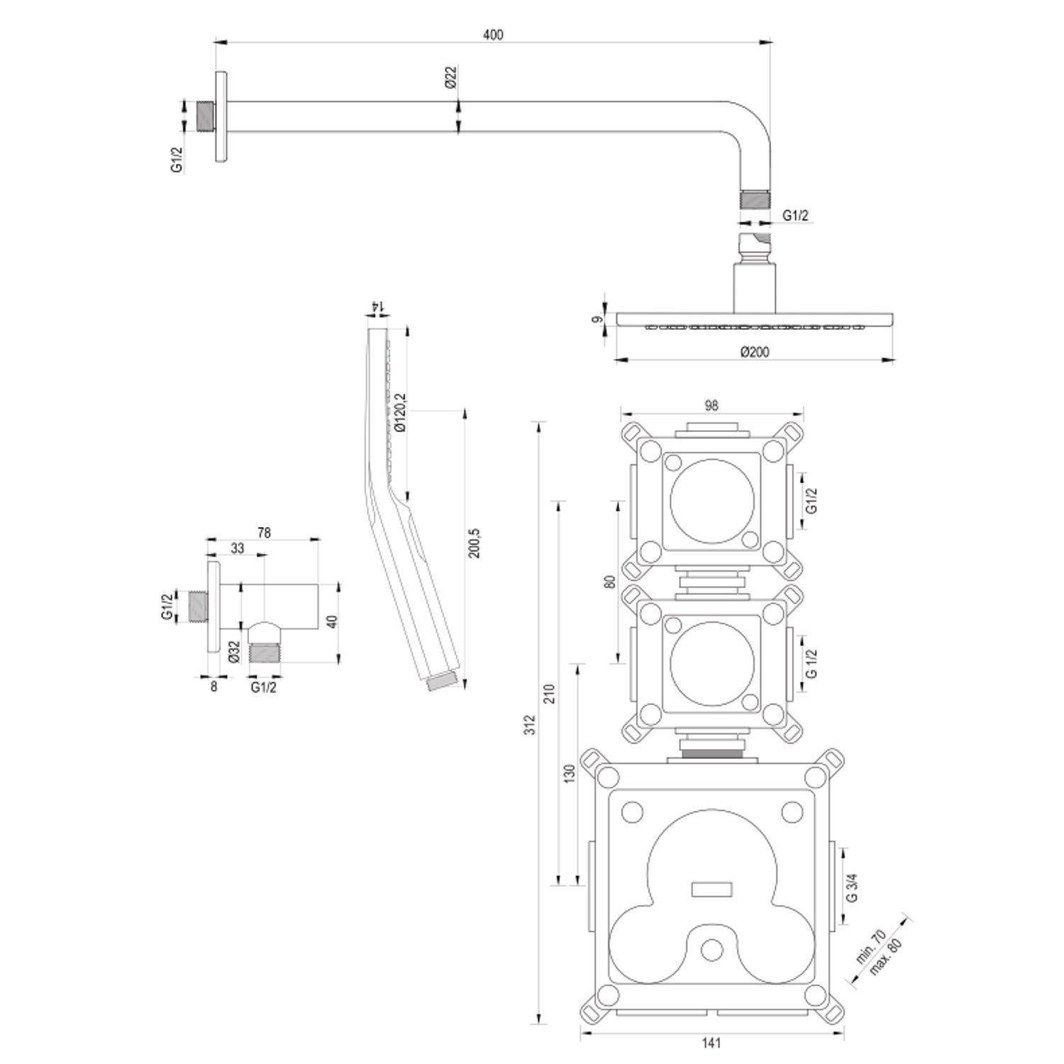 De set bestaat uit een inbouwthermostaat, een afbouw deel van de thermostaat kraan, een wandarm, een hoofddouche met een diameter van 20 cm, een handdouche inclusief wandarm en doucheslang. De thermostaatkraan, met 3/4'' aansluiting, is eenvoudig te bedienen door de twee knoppen. Met de grote knop kunt u eenvoudig de temperatuur van het water instellen. De thermostaat beschikt over een kinderbeveiliging bij 38 graden, waardoor u nooit per ongeluk onder een kokend hete douche zat staan. Door te draaien aan de twee kleinere knoppen kunt u de hoofd- en de handdouche bedienen