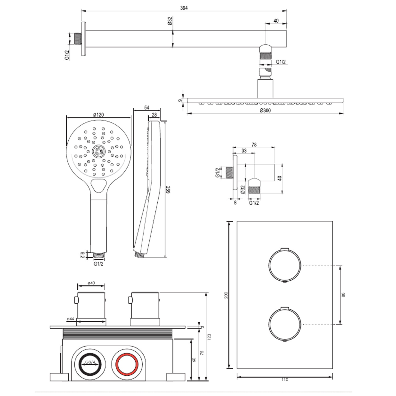 De set bestaat uit een inbouwthermostaat, een afbouw deel van de thermostaat kraan, een wandarm, een hoofddouche met een diameter van 30 cm, een handdouche inclusief wandarm en doucheslang. De thermostaatkraan, met 3/4'' aansluiting, is eenvoudig te bedienen door de twee knoppen. Met de onderste knop kunt u eenvoudig de temperatuur van het water instellen. De thermostaat beschikt over een kinderbeveiliging bij 38 graden, waardoor u nooit per ongeluk onder een kokend hete douche zat staan. met de bovenste knop bepaalt u de gewenste douchstand en kunt u switchen tussen de hoofd- en handdouche.