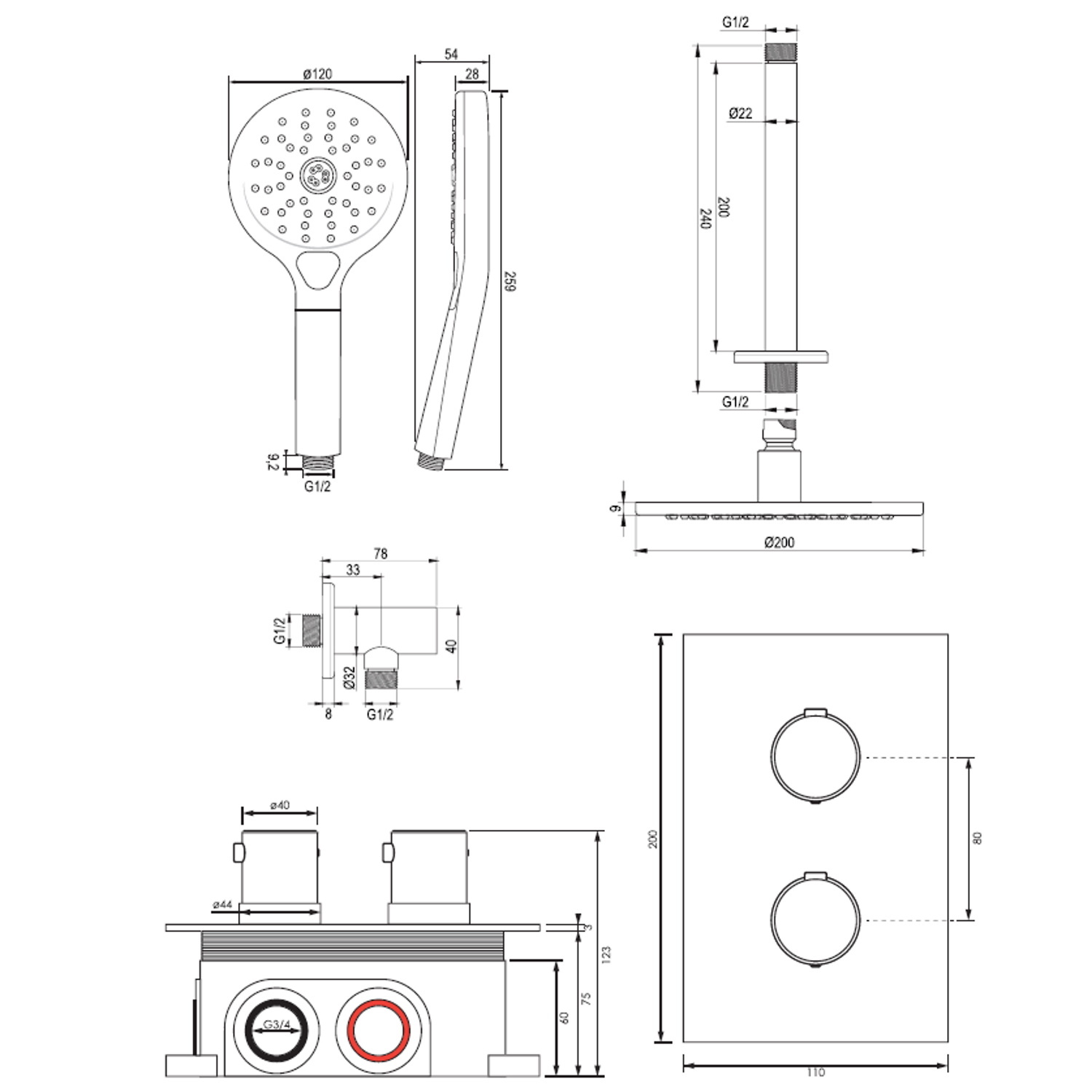 De set bestaat uit een inbouwthermostaat, een afbouw deel van de thermostaat kraan, een plafond uitloop, een hoofddouche met een diameter van 20 cm, een handdouche inclusief wandarm en doucheslang. De thermostaatkraan, met 3/4'' aansluiting, is eenvoudig te bedienen door de twee knoppen. Met de onderste knop kunt u eenvoudig de temperatuur van het water instellen. De thermostaat beschikt over een kinderbeveiliging bij 38 graden, waardoor u nooit per ongeluk onder een kokend hete douche zat staan. met de bovenste knop bepaalt u de gewenste douchstand en kunt u switchen tussen de hoofd- en handdouche.