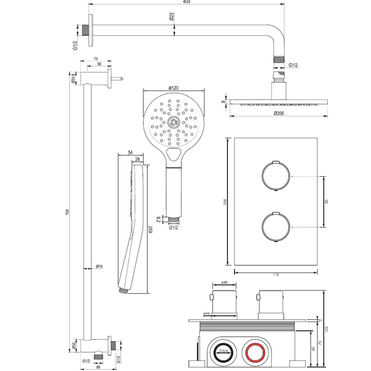 De set bestaat uit een inbouwthermostaat, een afbouw deel van de thermostaat kraan, een wandarm, een hoofddouche met een diameter van 20 cm, een handdouche inclusief glijstang en doucheslang. De thermostaatkraan, met 3/4'' aansluiting, is eenvoudig te bedienen door de twee knoppen. Met de onderste knop kunt u eenvoudig de temperatuur van het water instellen. De thermostaat beschikt over een kinderbeveiliging bij 38 graden, waardoor u nooit per ongeluk onder een kokend hete douche zat staan. met de bovenste knop bepaalt u de gewenste douchstand en kunt u switchen tussen de hoofd- en handdouche.