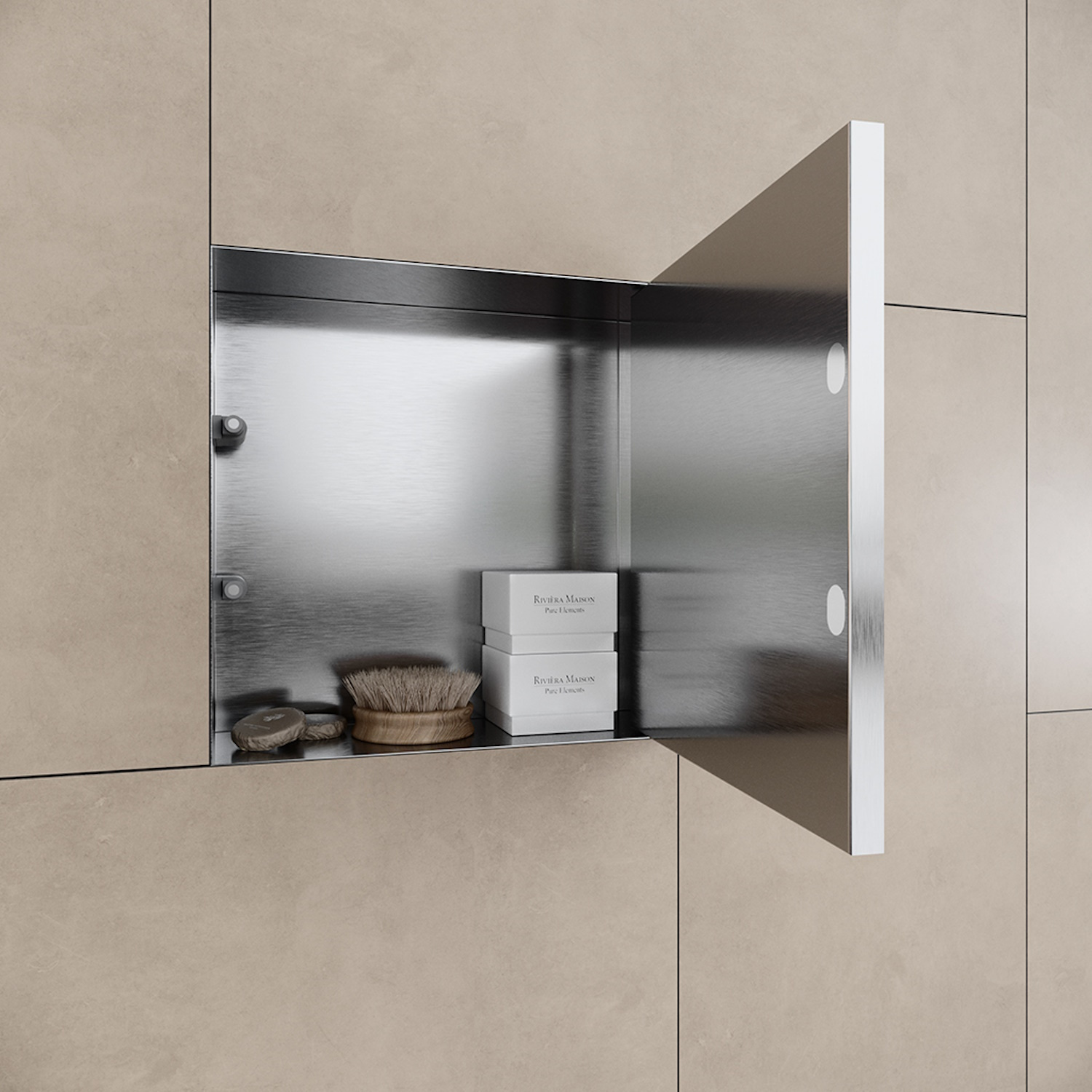 Deze Inbouwnis is van het merk Boss & Wessing uit de serie Alfie. Met een inbouwnis word er extra opbergruimte gecreëren in de badkamer of doucheruimte. De nis bestaat uit een RVS basis dat in de muur kan worden bevestigd voor een stevige bevestiging. De installatie is ontworpen om in elke ruimte te passen, waarbij het elegante design word gecombineerd met ruimteoptimalisatie. De inbouwnis is gemaakt van RVS 304 met een geborstelde finish en heeft een deur voor een tegel tot 12 mm dik, waardoor deze nis bijna onzichtbaar is.