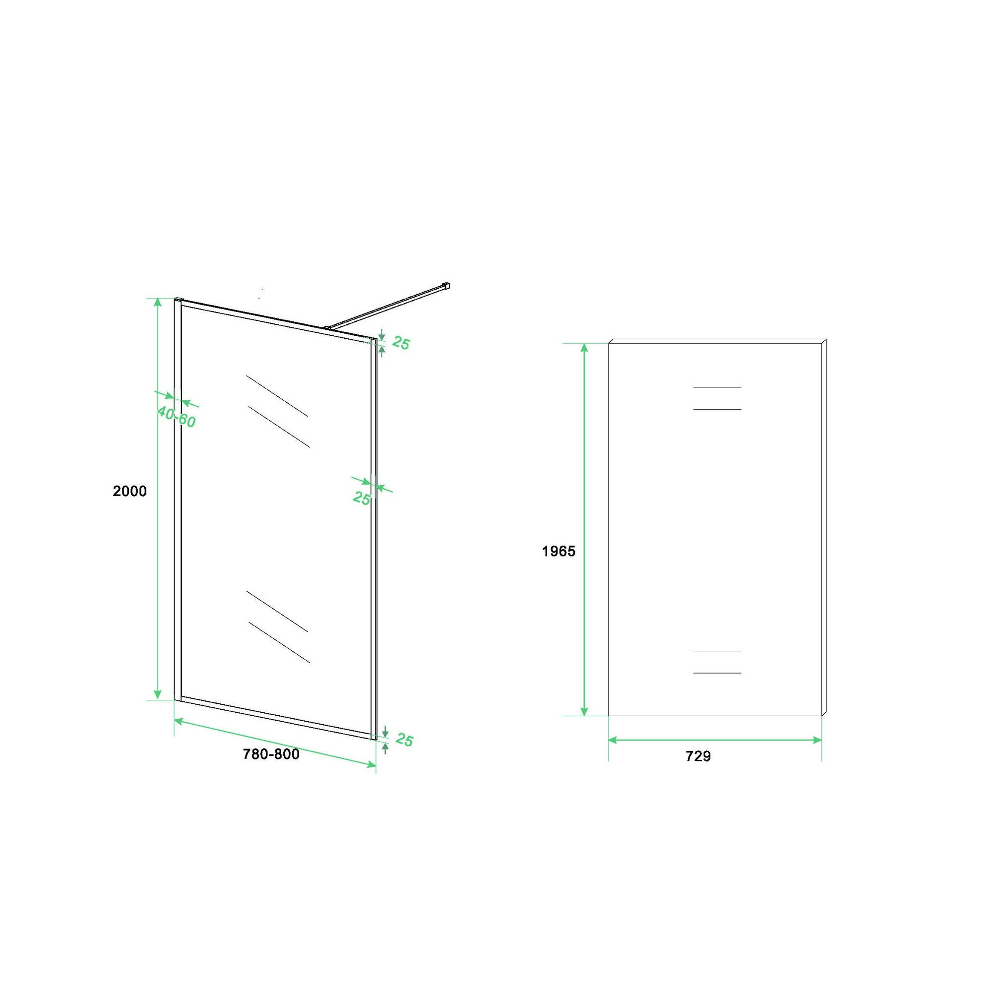 De inloopdouche heeft een breedte van 80 cm en een hoogte van 200 cm. Verder wordt de inloopdouche inclusief een mat zwarte stabilisatiestang met koppelstuk geleverd.