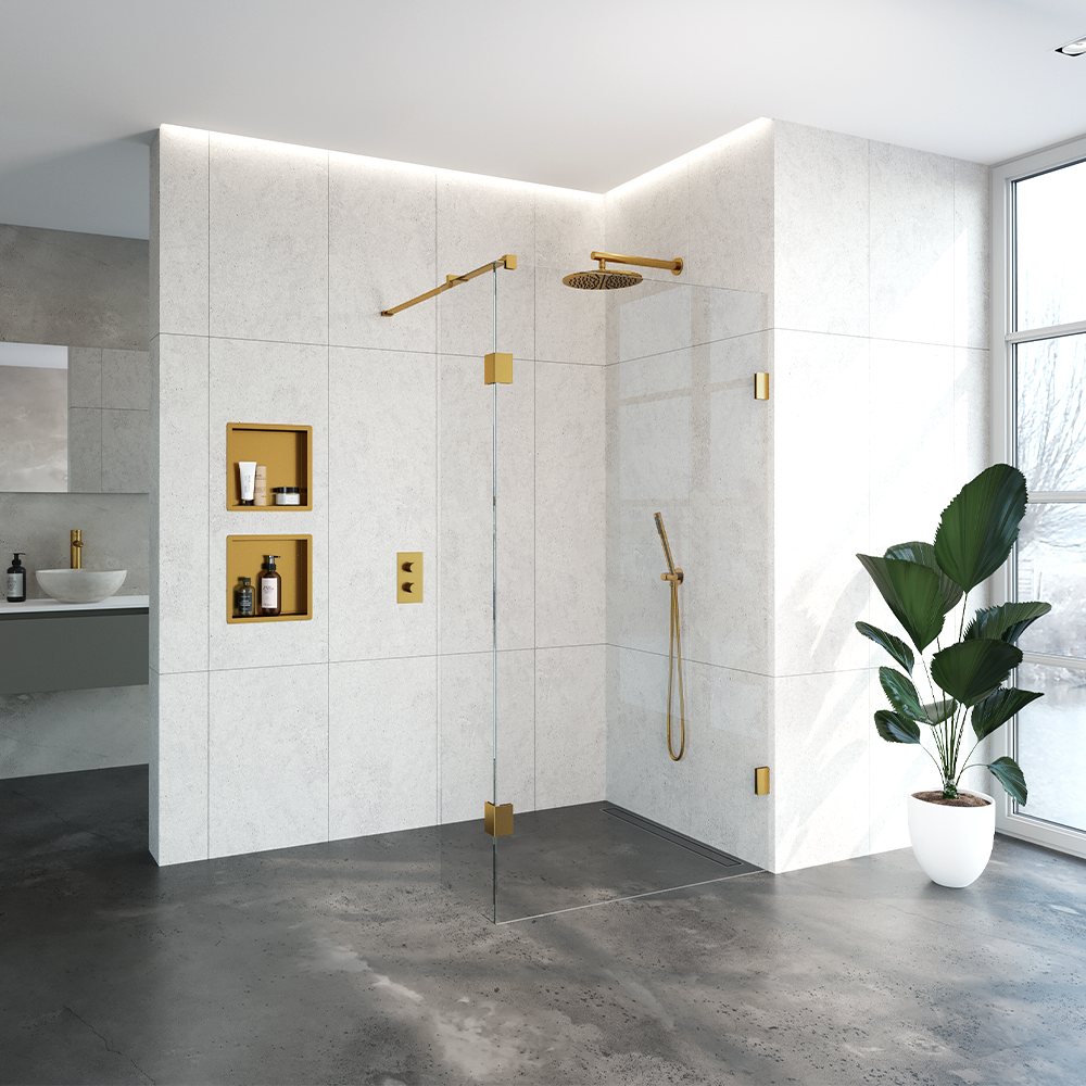Deze complete inloopdouche bestaat uit een inloopwand en zijwand met Goud beslag. Inclusief glasbehandeling. De hoogte van de inloopdouche is 200 cm. Hij is 107,7 cm breed en maximaal 200 cm diep. Deze inloopdouche straalt luxe uit door zijn design en kleur.