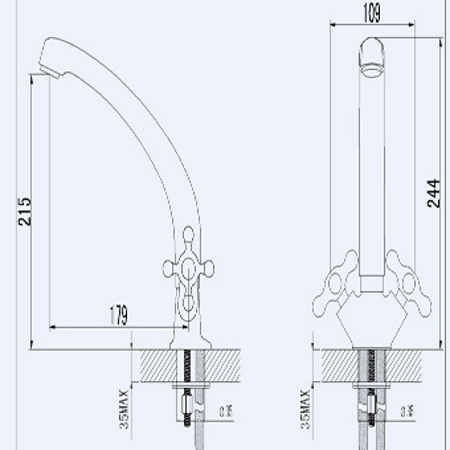 Deze keukenkraan van Plieger Charleston heeft een nostalgische vormgeving en komt het best tot zijn recht in een klassiek, landelijk of brocant interieur. Hij heeft een sierlijk gebogen, draaibare uitloop en mooie, klassieke kruisgrepen. De kraan is 24,4 cm hoog en heeft een uitloop van 17,9 cm lang.