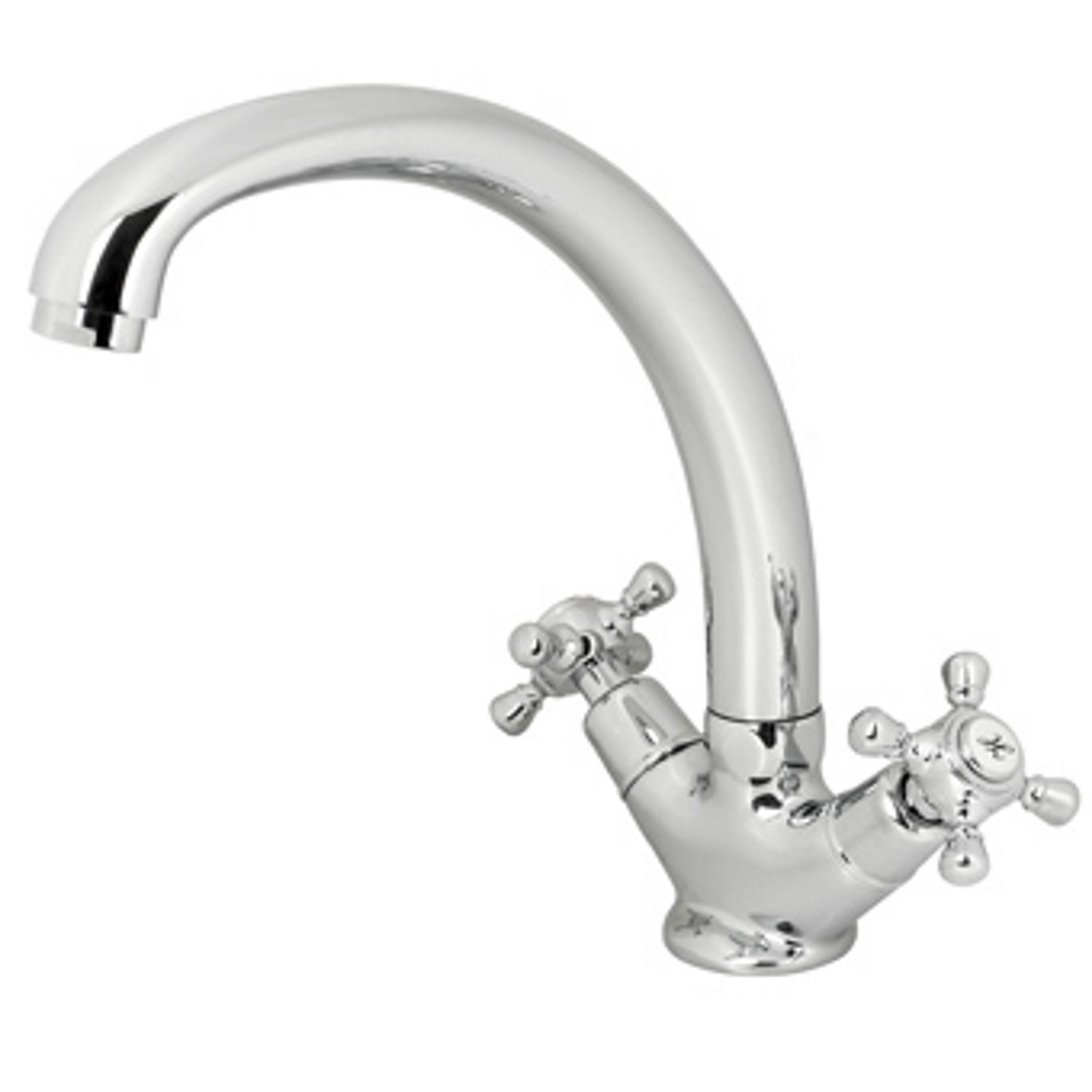 Door aan de linker en rechter kruisgrepen te draaien mengt u warm en koud water tot de gewenste temperatuur. De kraan is van messing, afgewerkt met glanzend chroom.