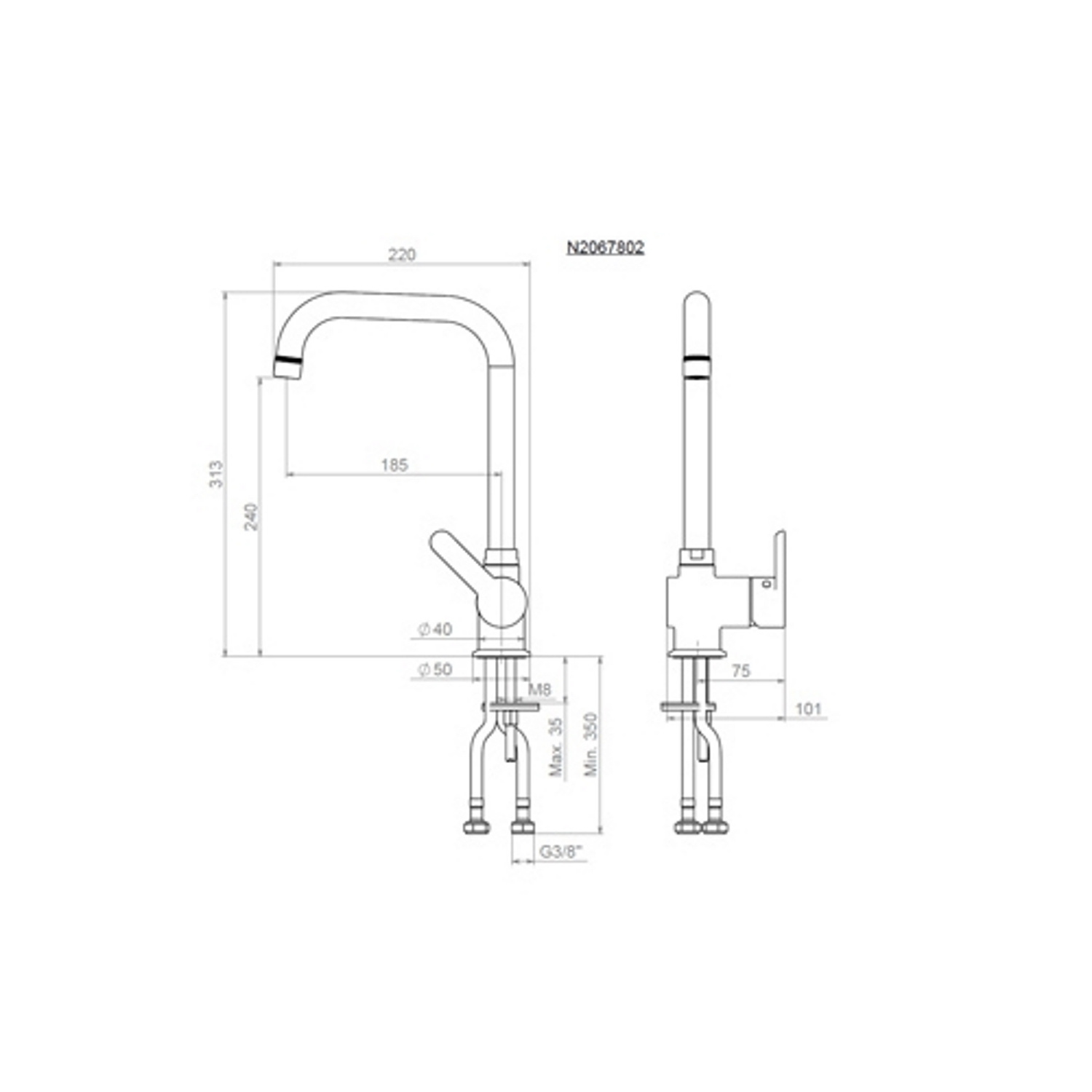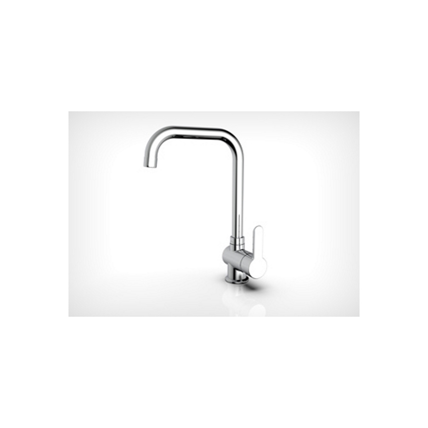 Keukenmengkraan Voda van Plieger met hoge uitloop geeft uw wasbak een moderne uitstraling. De kraan is 31,3 cm hoog, 10,1 cm breed en 22 cm diep. De uitloop is 24 cm hoog en 18,5 lang. Hij is van messing met een mooie glanzende chroom kleur.