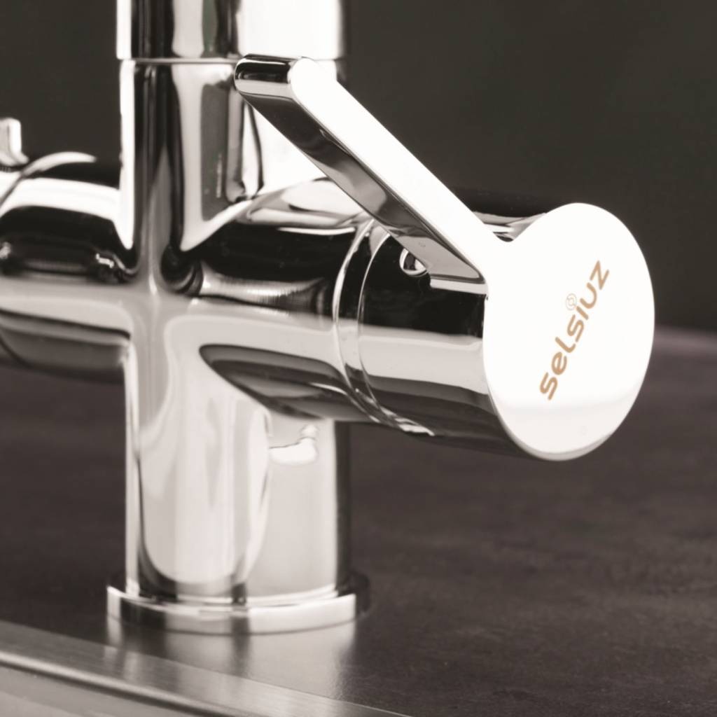 Met de linker knop kunt u met de druk-draaibediening kokend water tappen; de rechterhendel geeft koud en warm water. Het kraangat is net als bij de meeste andere kranen 35 mm. Deze kokend waterkraan is in twee modellen leverbaar: haaks en rond. De kraan is een Europees fabricaat, en is degelijk in het gebruik en mooi vormgegeven. De kraan is vervaardigd van messing en is in RVS afgewerkt.