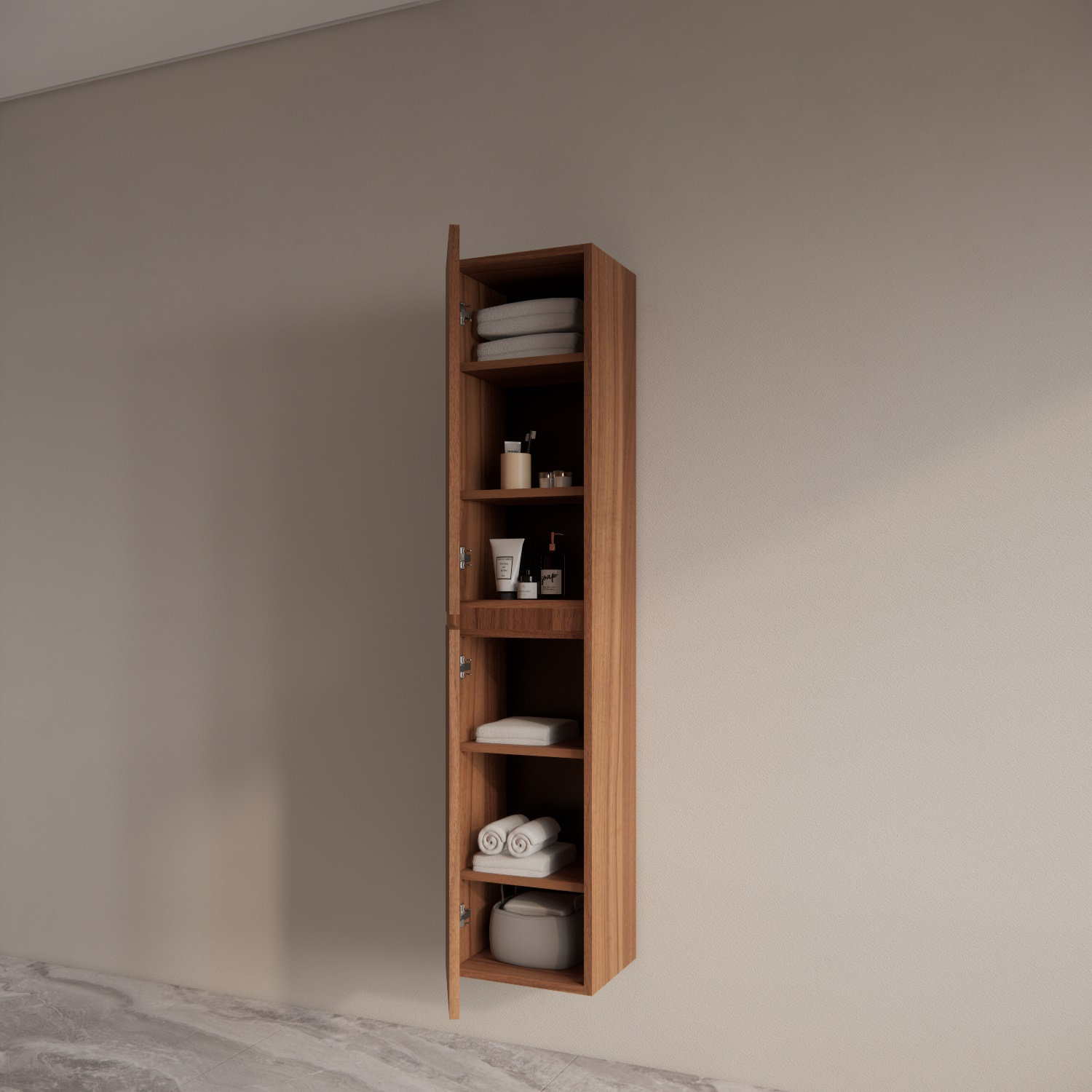 De kolomkast heeft een hoogte van 160 cm met een breedte en diepte van maar liefst 35 cm. In de kolomkast zitten 5 planken die zorgen voor extra opbergruimte in de badkamer. De kolomkast is voorzien van 2 softclose deurtjes en de gehele kast heeft een prachtige Walnoot kleurafwerking. De kolomkast is gemaakt van het materiaal melamine.