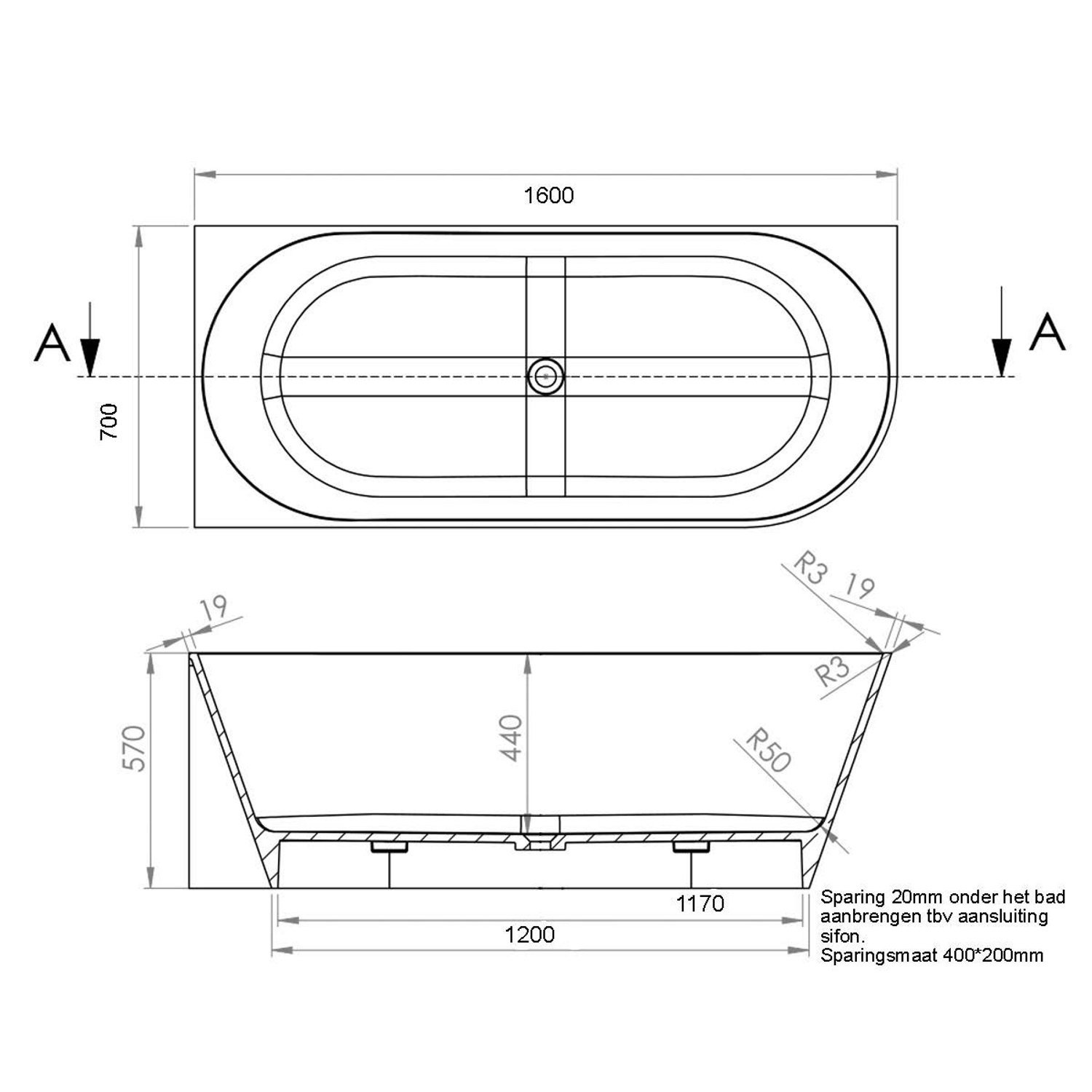 Het bad is 160 cm lang en 70 cm breed. De binnenmaat is 120x44 cm. Dit maakt het bad uitermate geschikt om lang uit in te liggen.