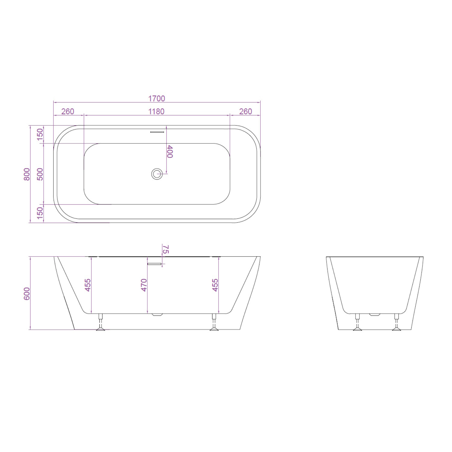 Het ligbad heeft een mat witte afwerking. Het bad is geschikt voor de installatie tegen de wand. Het bad heeft een lengte van 170 cm, een breedte van 80 cm en een totale hoogte van 60 cm.