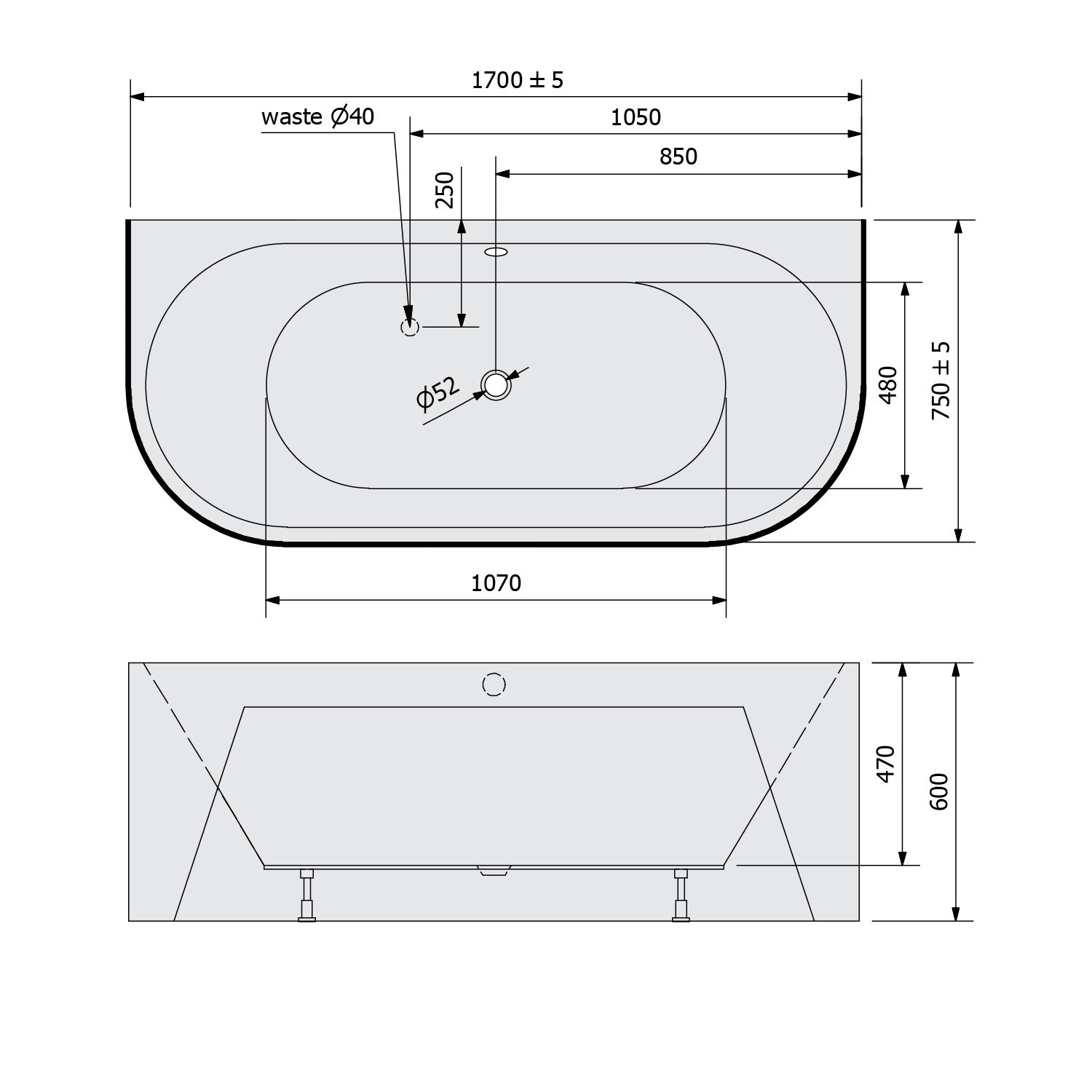 Het bad heeft een lengte van 170 cm, een breedte van 75 cm en een totale hoogte van 60 cm. De zitdiepte van het bad bedraagt 47 cm. Het bad wordt geleverd exclusief sifon en waste.