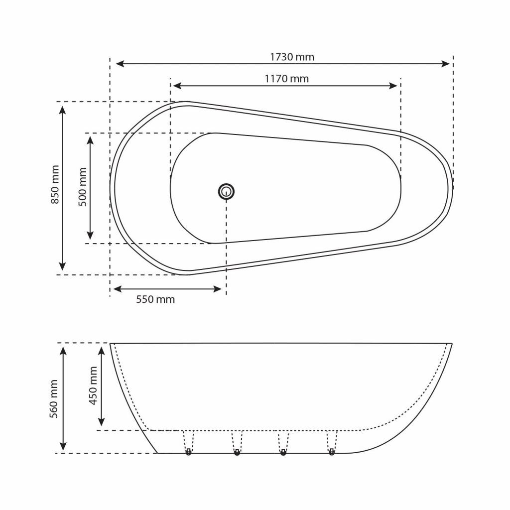 Het ligbad heeft een lengte van 173 cm, een breedte van 85 cm, een diepte van 56 cm en is wit van kleur. Het bad is gemaakt van acryl en de diameter van de afvoergat bedraagt 52 mm.