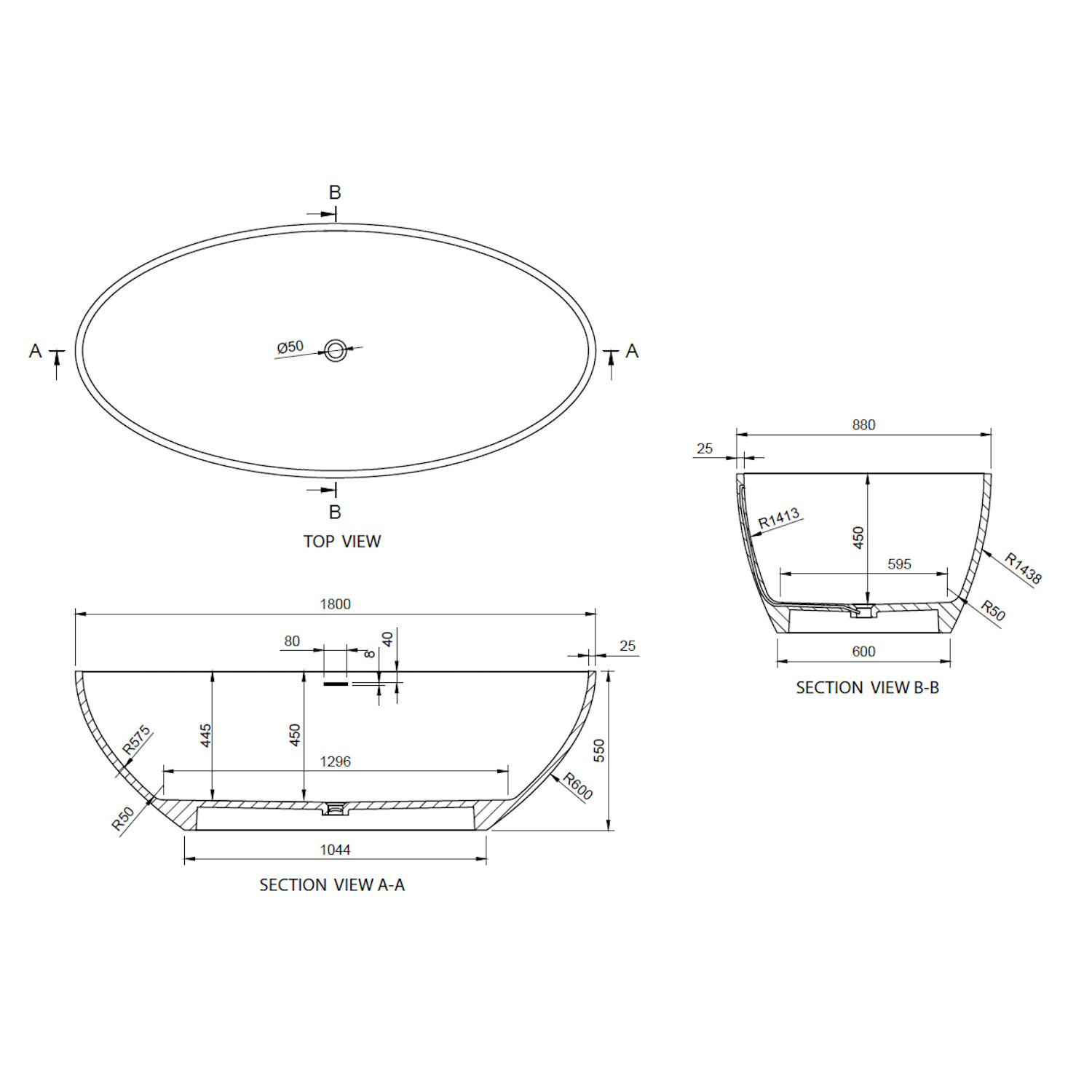 De afmetingen van het ligbad zijn lengte 180 cm, breedte 88 cm en de diepte 55 cm. Met het bad heeft u geen badpoten nodig. Het bad heeft een inhoud van 340 liter water. Het bad is voorzien van een overloop gat en wordt geleverd met een afvoerplug met een Mat Zwarte afwerking en een afvoer.