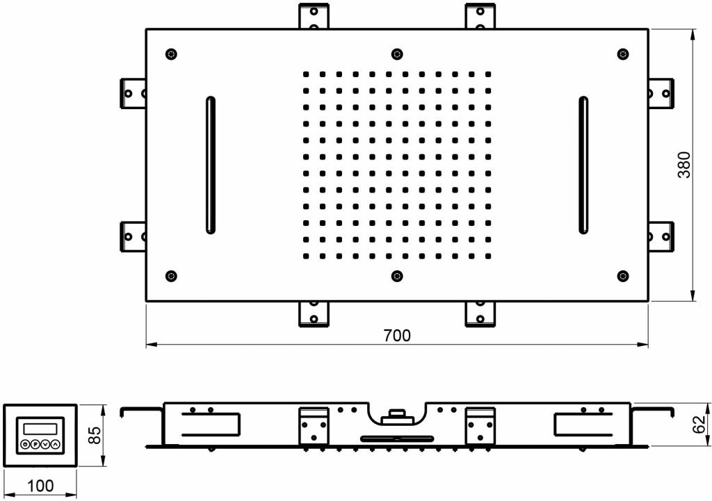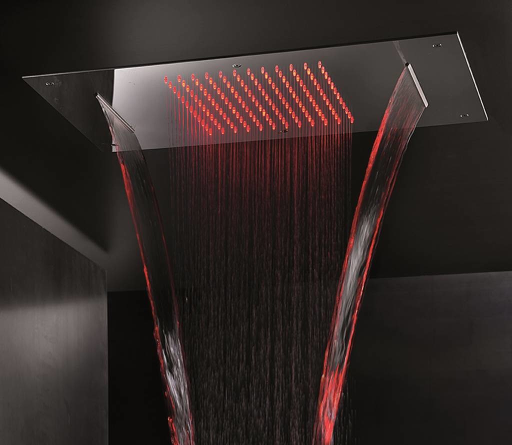 Rechthoekige inbouw hoofddouche van 38 bij 70 cm, met LEDs. Bij deze hoofddouche krijgt u een afstandsbediening, hiermee kunt u de LEDs zelf instellen in 1 van de 9 kleuren. Daarnaast heeft u keuze uit een van de twee chromotherapie programma's; exciting of relaxing. Deze hoofddouche heeft ook twee watervallen en is verkrijgbaar in gepolijst of geborsteld RVS