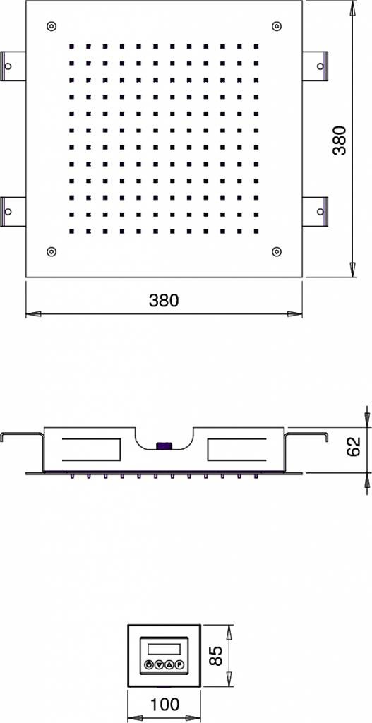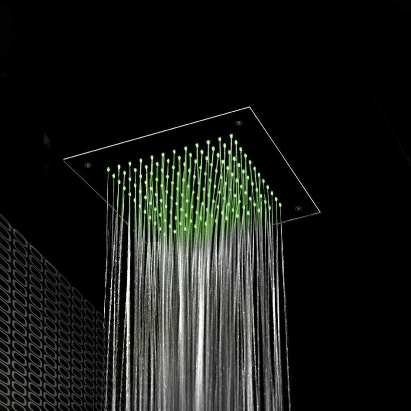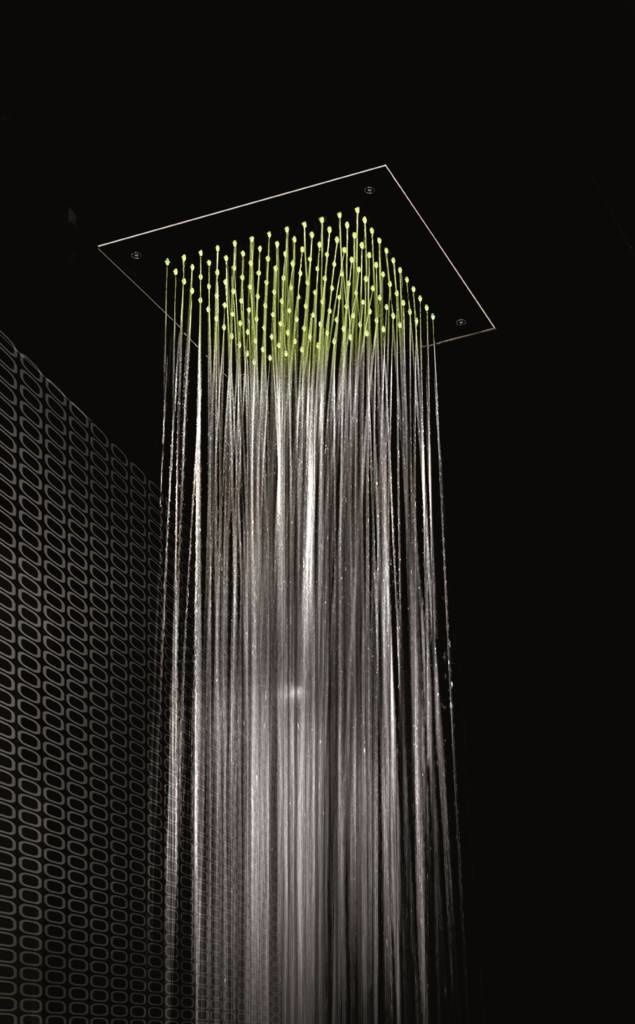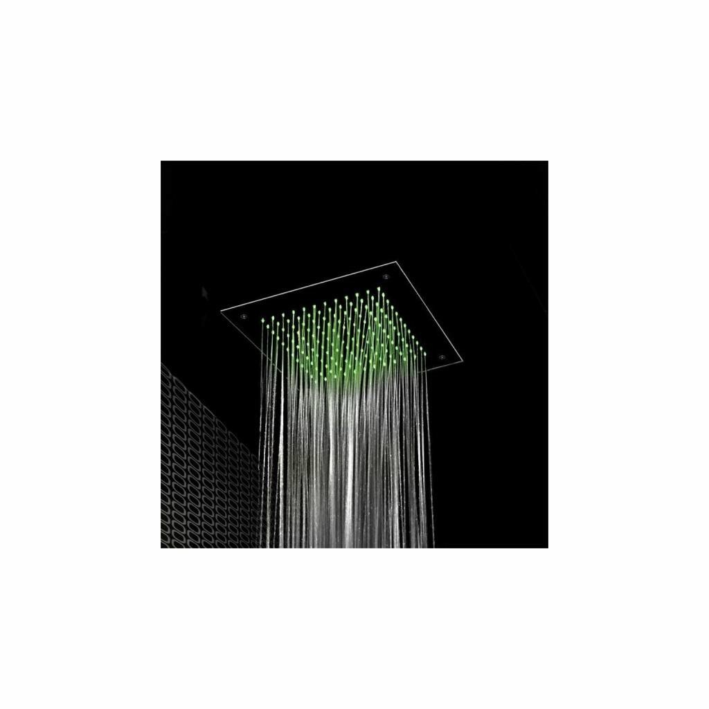 Vierkante inbouw hoofddouche van 38 cm met een LED lichtfunctie. Iedere tuit van deze hoofddouche beschikt over een enkele LED van 12 volts, met deze lichtjes creëert u een prachtig licht effect onder de douche/in uw badkamer. U kunt deze hoofddouche zelf afstellen op een van de negen kleuren, daarnaast kunt u kiezen uit twee voorgeprogrammeerde chromotherapie programma's; Relaxing of exciting.