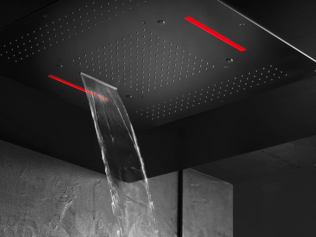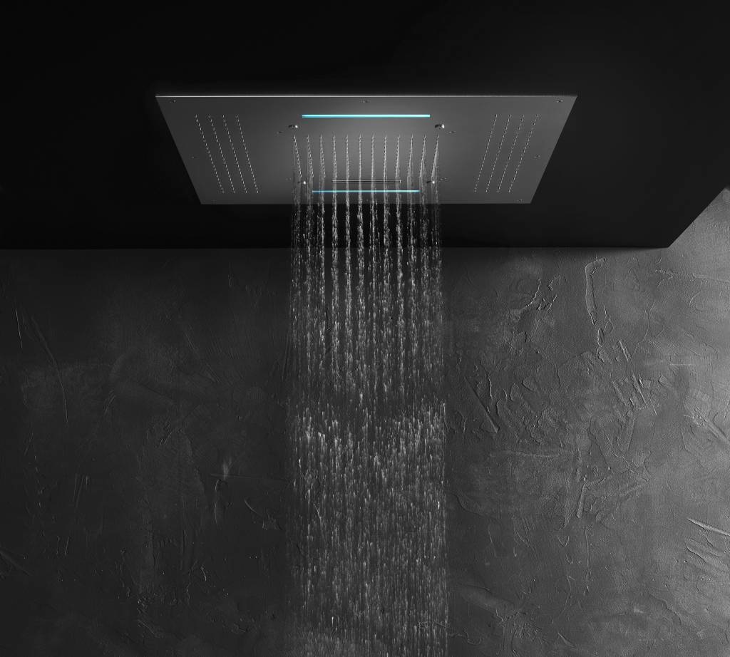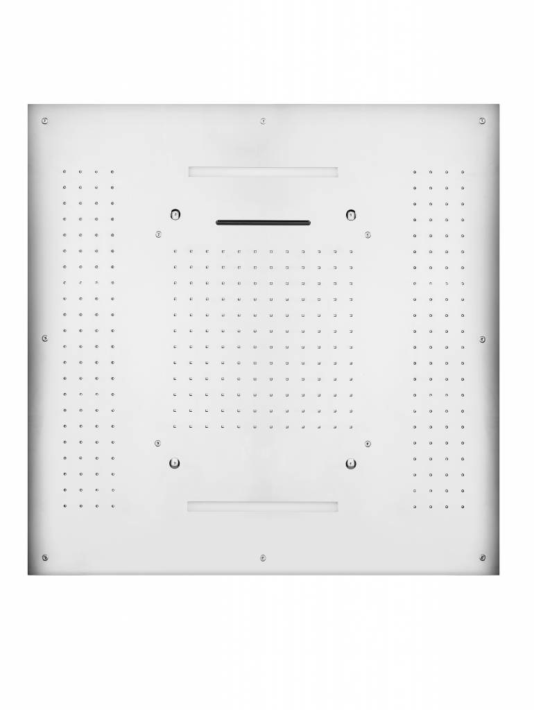 Vierkante inbouw hoofddouche van 95 cm vervaardigd uit RVS. Deze hoofddouche beschikt over een waterval, een nevel functie en LED verlichting. U kunt de LED verlichting van deze hoofddouche met de afstandsbediening afstellen op een van de negen kleuren, ook kunt u een van de twee chromotherapie programma's kiezen.