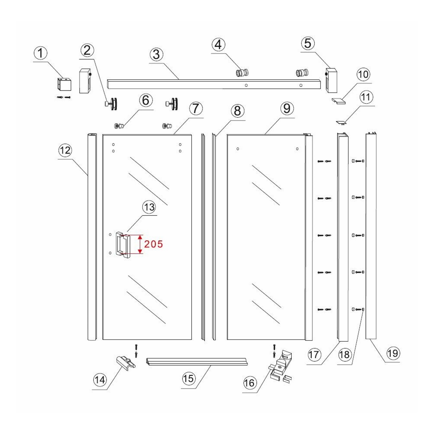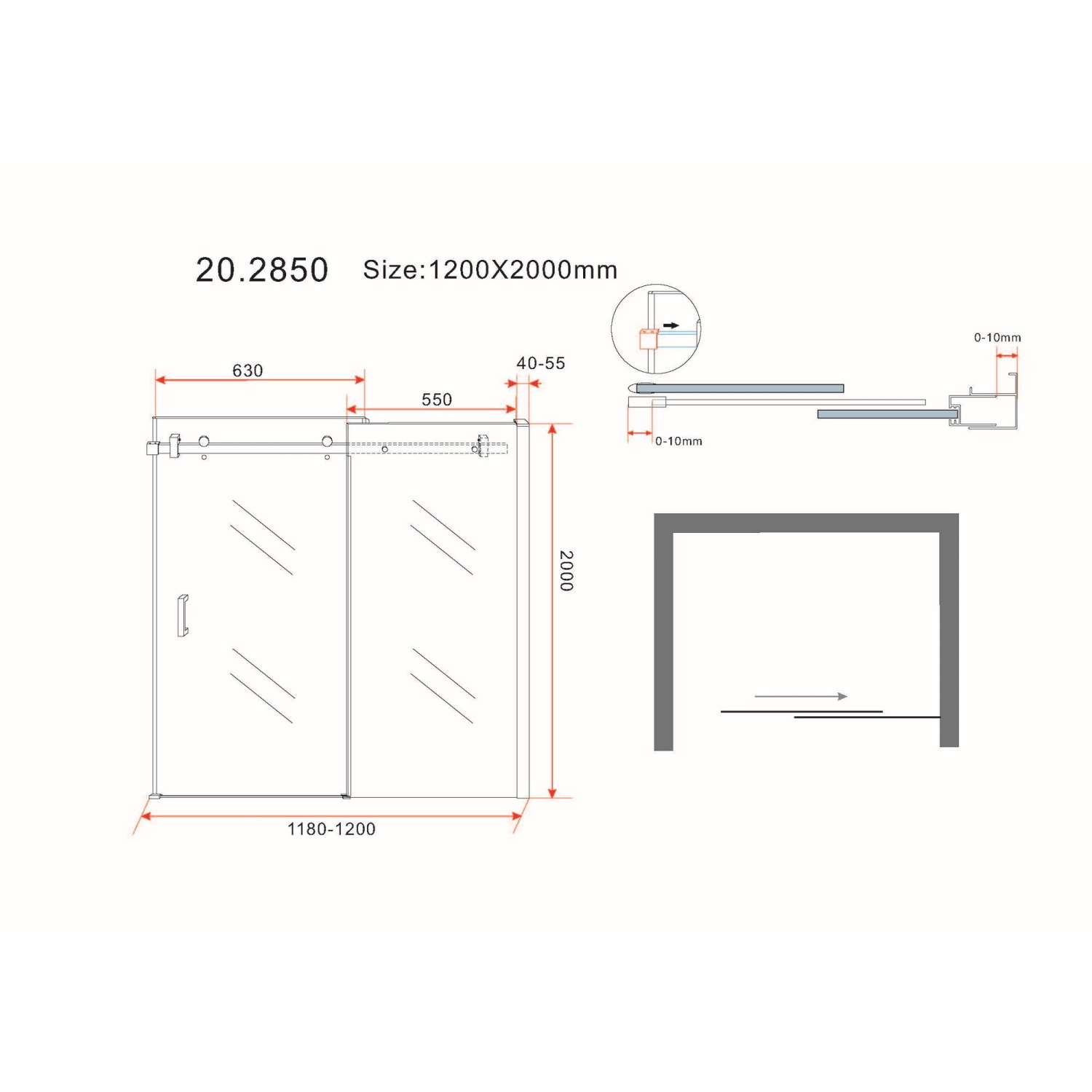 De douchedeur kent een breedte van 120 cm en een hoogte van 200 cm. De ophanging van het artikel gebeurt door middel van grote RVS wielen.
