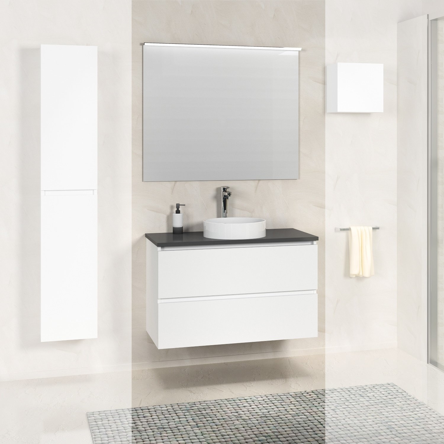 De onderkast heeft een breedte van 80 cm, bevat twee lades en een stenen blad.