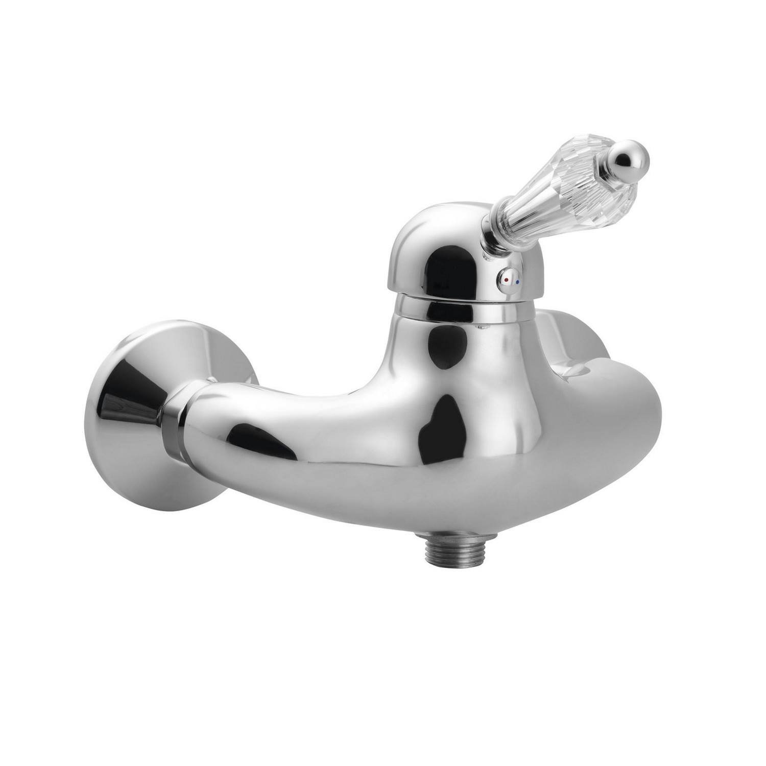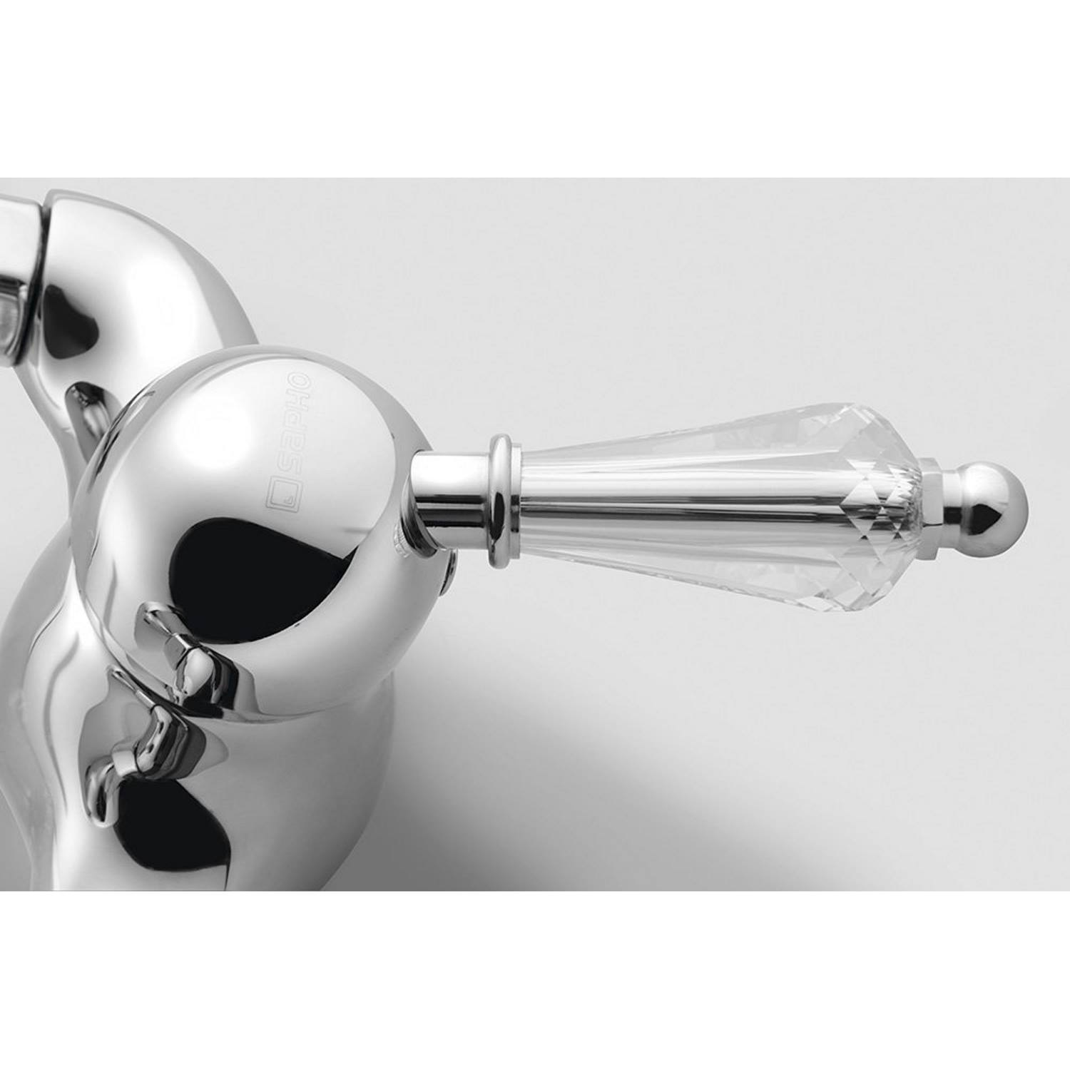 De twee kranen voor warm en koud water zijn hier vervangen door een mechaniek waarin de doorstroming van het koude en warme water met een kristal hefboom wordt bedient. Door de hendel aan de bovenkant horizontaal te bewegen reguleert u de verandering van de temperatuur van het water terwijl de verticale beweging de stroomsnelheid bepaalt. Omlaag om de kraan te sluiten, omhoog om hem te openen.