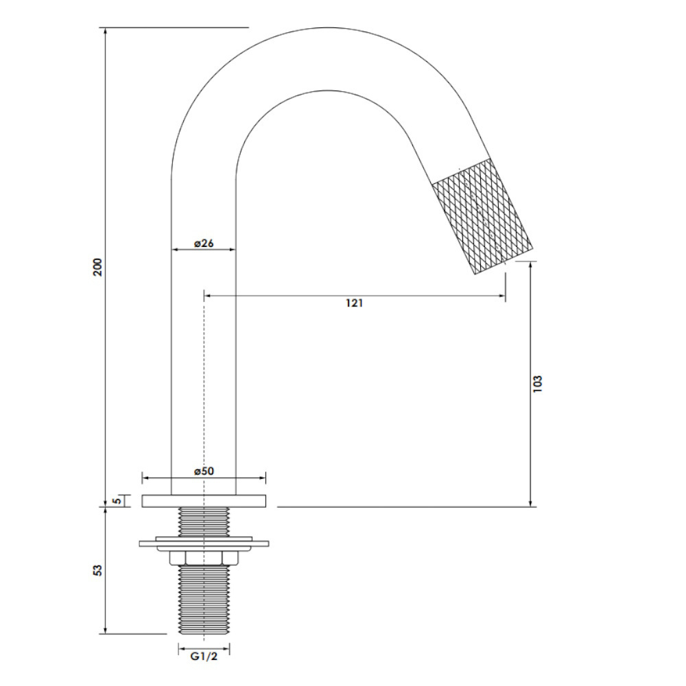 De fonteinkraan heeft een uitloop hoogte van 10,3 cm en een diameter van 2,6 cm. De aansluiting van de fonteinkraan is 1/2 inch en gemaakt van messing.
