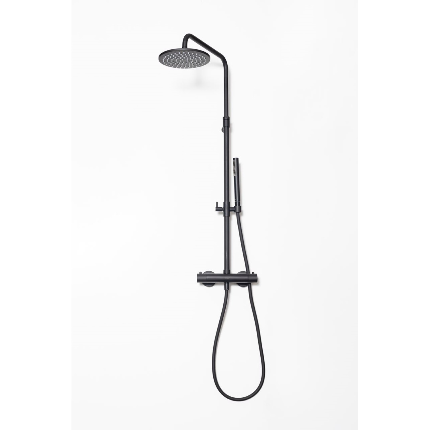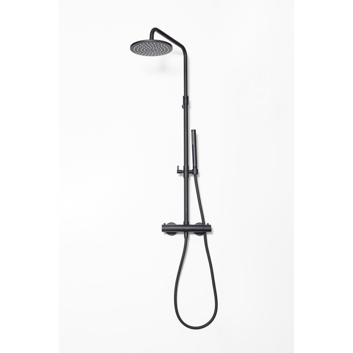 De glijstang is rond van vorm en is in hoogte verstelbaar. De minimale hoogte bedraagt 75,1 cm, terwijl de maximale hoogte 122,1 cm bedraagt. De hoofddouche is rond van vorm en heeft een diameter van 20 cm. Tot slot is de set uitgerust met een handdouche en een bijbehorende doucheslang. Alle artikelen uit deze set hebben een afwerking in de kleur mat zwart. Tevens is deze regendoucheset leverbaar in de kleuren chroom en geborsteld nikkel.