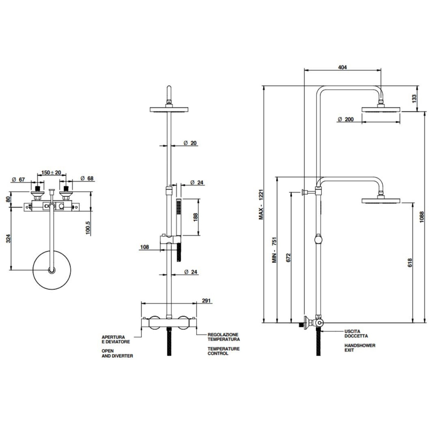 De glijstang is rond van vorm en is in hoogte verstelbaar. De minimale hoogte bedraagt 75,1 cm, terwijl de maximale hoogte 122,1 cm bedraagt. De hoofddouche is rond van vorm en heeft een diameter van 20 cm. Tot slot is de set uitgerust met een handdouche en een bijbehorende doucheslang. Alle artikelen uit deze set hebben een afwerking in de kleur chroom. Tevens is deze regendoucheset leverbaar in de kleuren geborsteld nikkel en mat zwart.