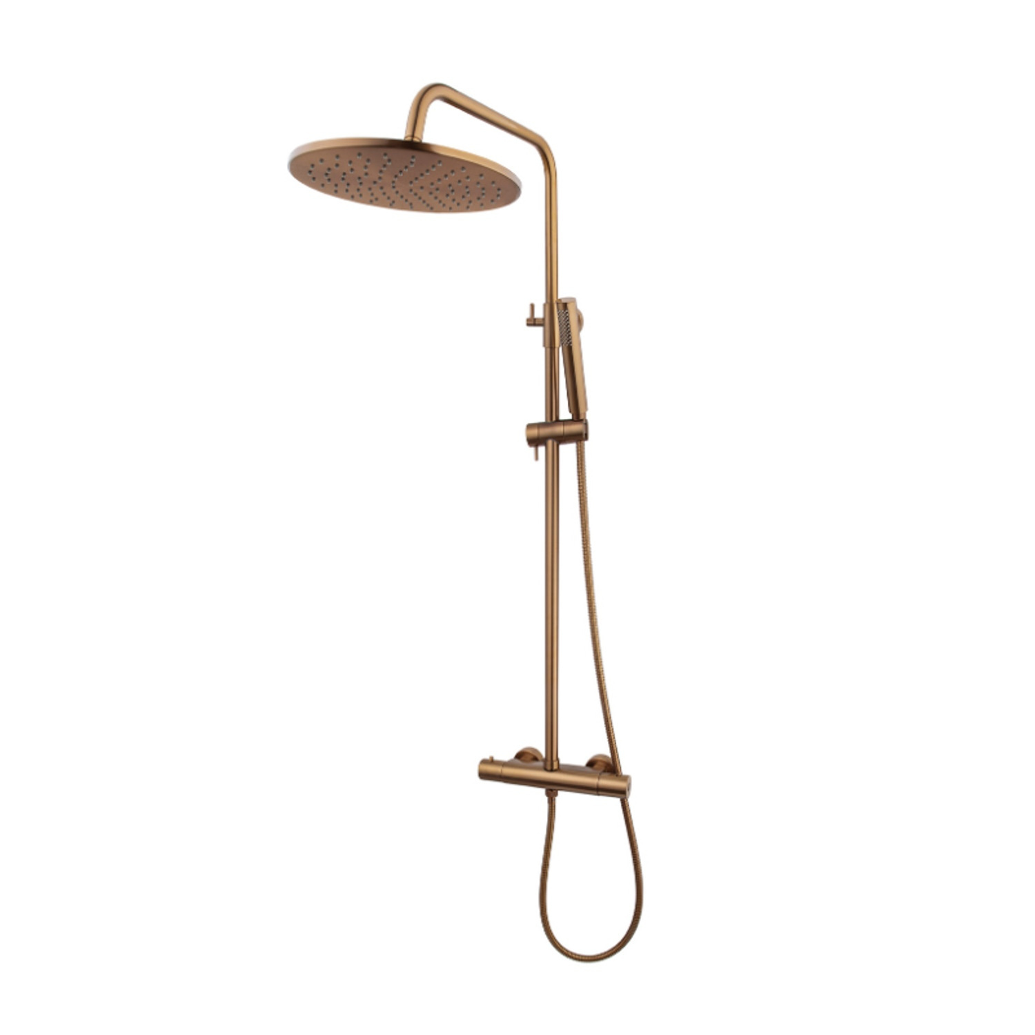Deze complete regendoucheset is van het merk Wiesbaden en behoort tot de serie Caral. De opbouw regendoucheset bestaat uit een thermostatische kraan, een glijstang met uitloop, een ronde hoofddouche en een handdoucheset. Alle elementen uit deze regendoucheset zijn afgewerkt in de kleur koper, wat deze regendoucheset geschikt maakt voor zowel de moderne als de industriële badkamer.