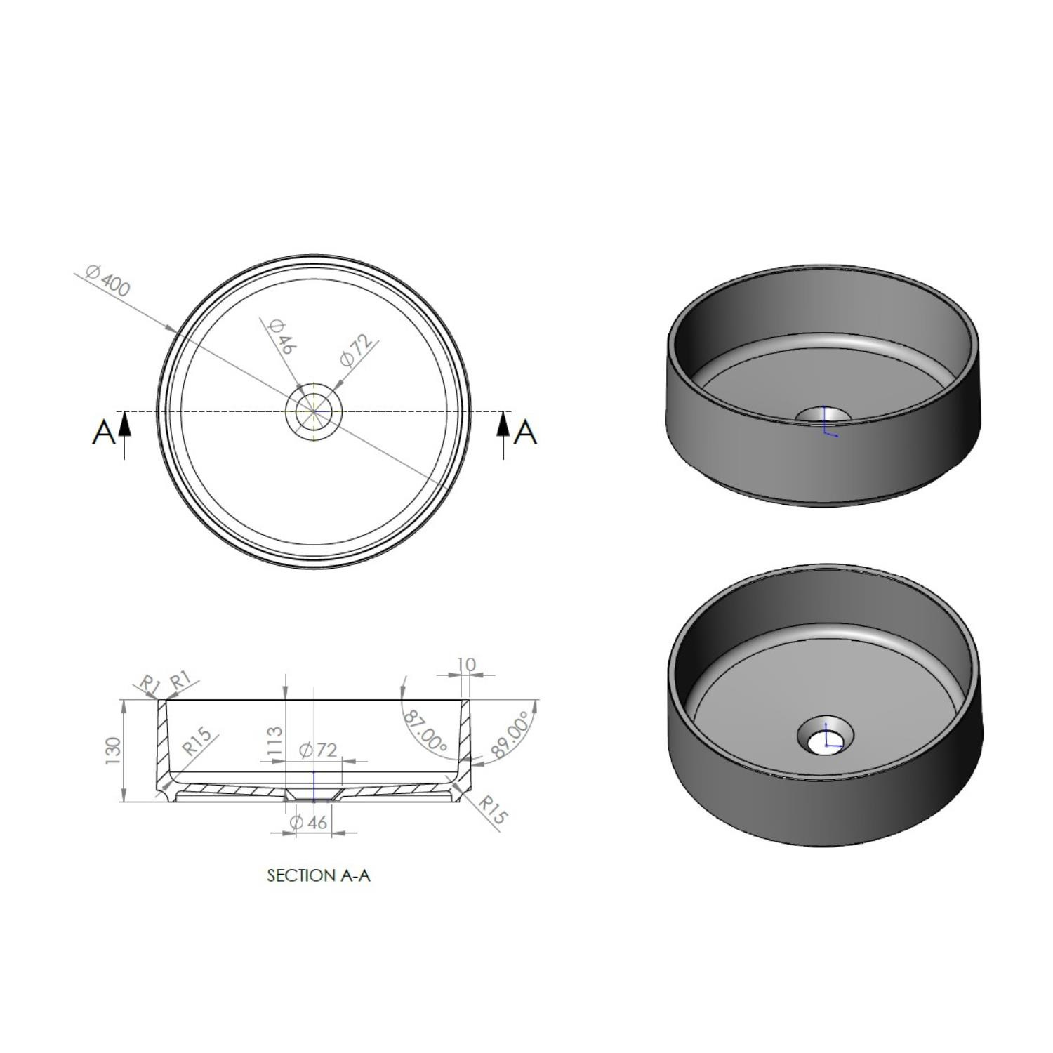 Deze specificieke waskom is rond en heeft een diameter van 40 cm. De kom is 13 cm hoog. Deze kom is uitgevoerd in een mat zwarte kleur.